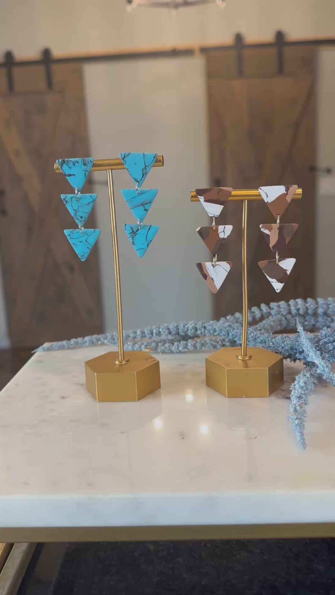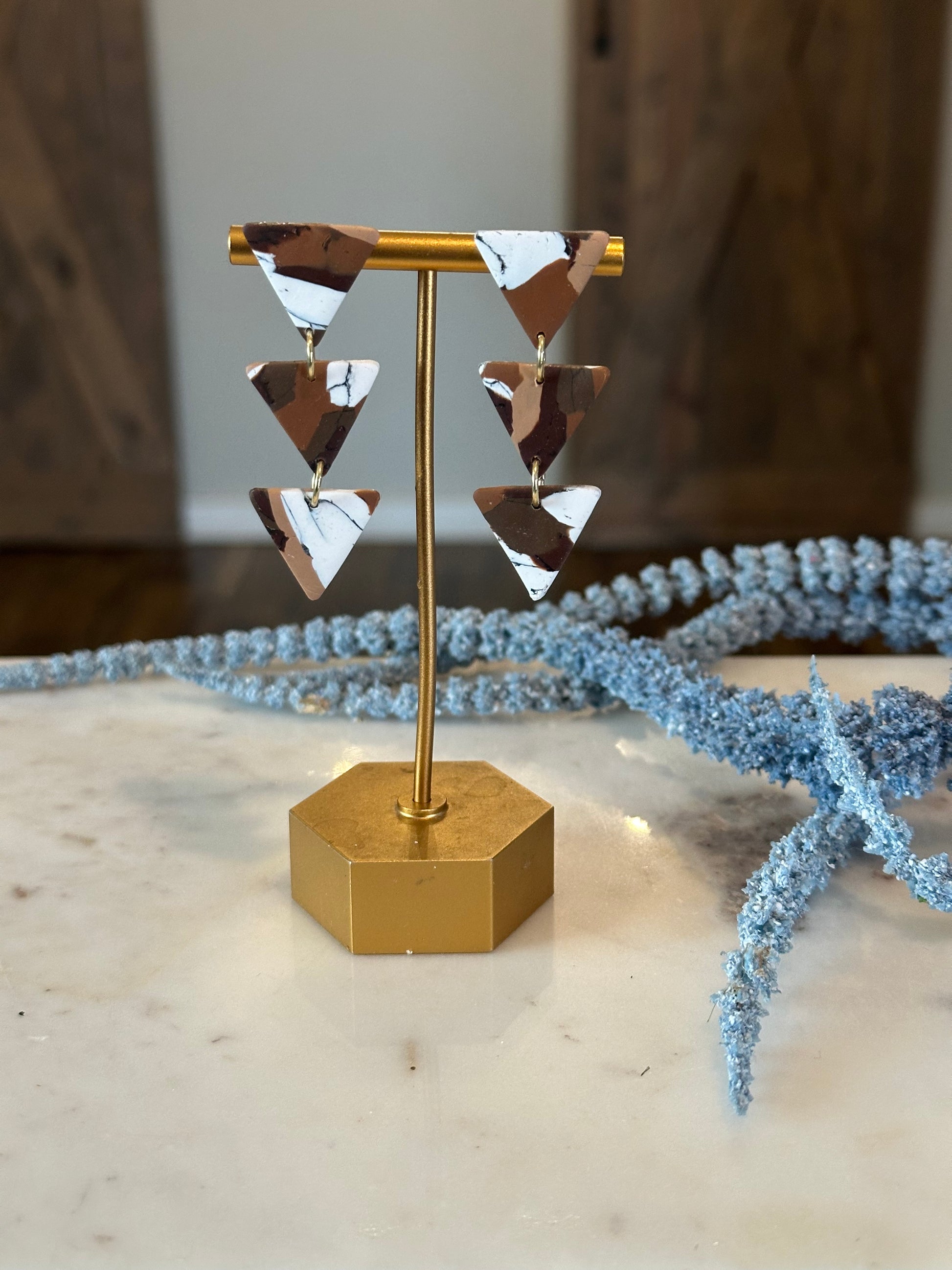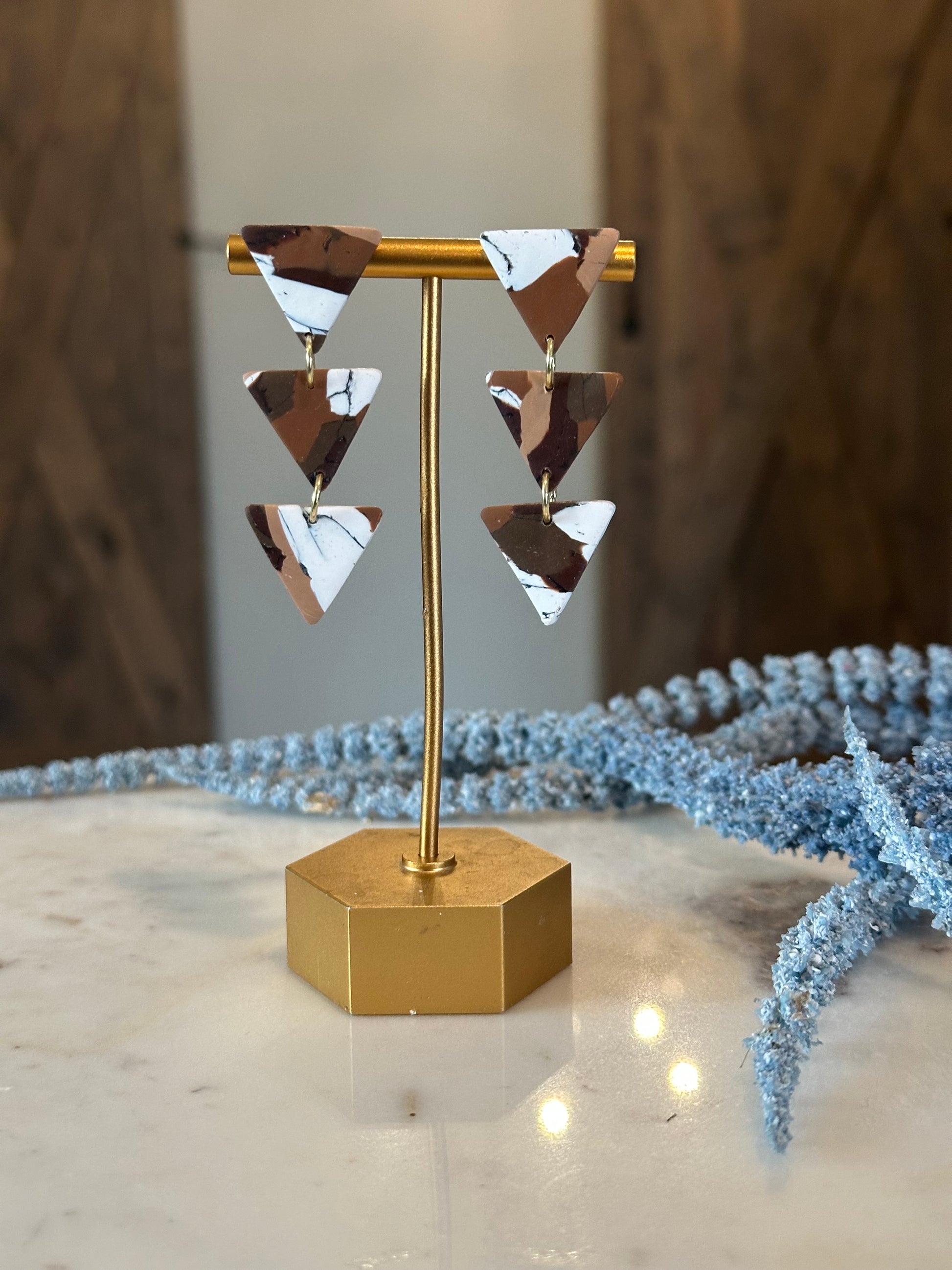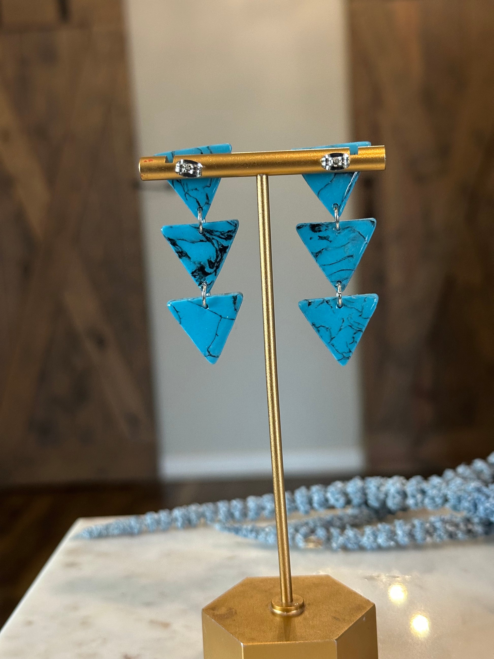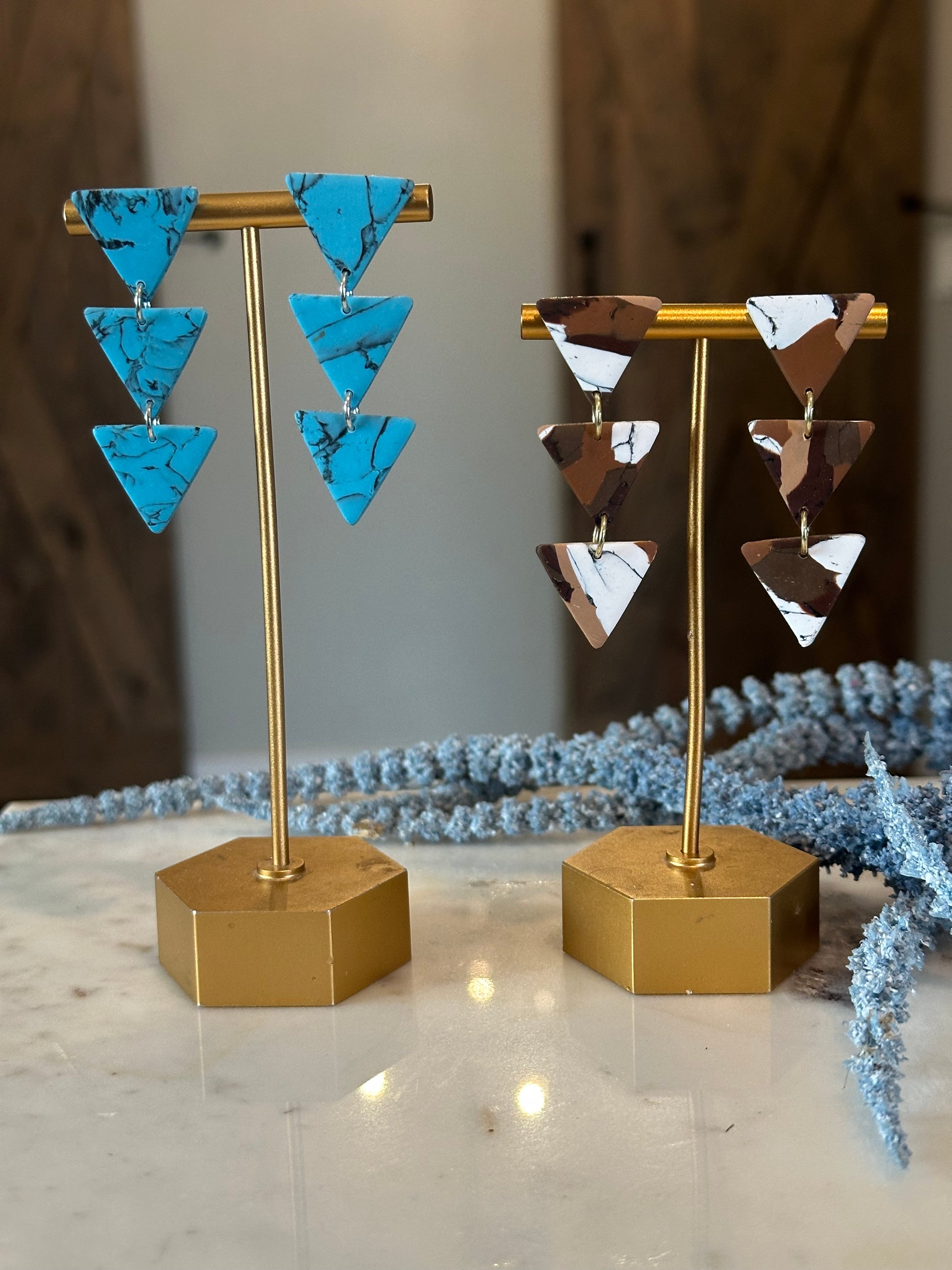 Enhance your boho style with these unique Triangle Drop Earrings. Made from durable polymer clay, these 3 tier earrings feature a stunning turquoise design or brown marbled pattern. Perfect for casual or dressy occasions, these stylish and one-of-a-kind earrings are sure to make a statement.
