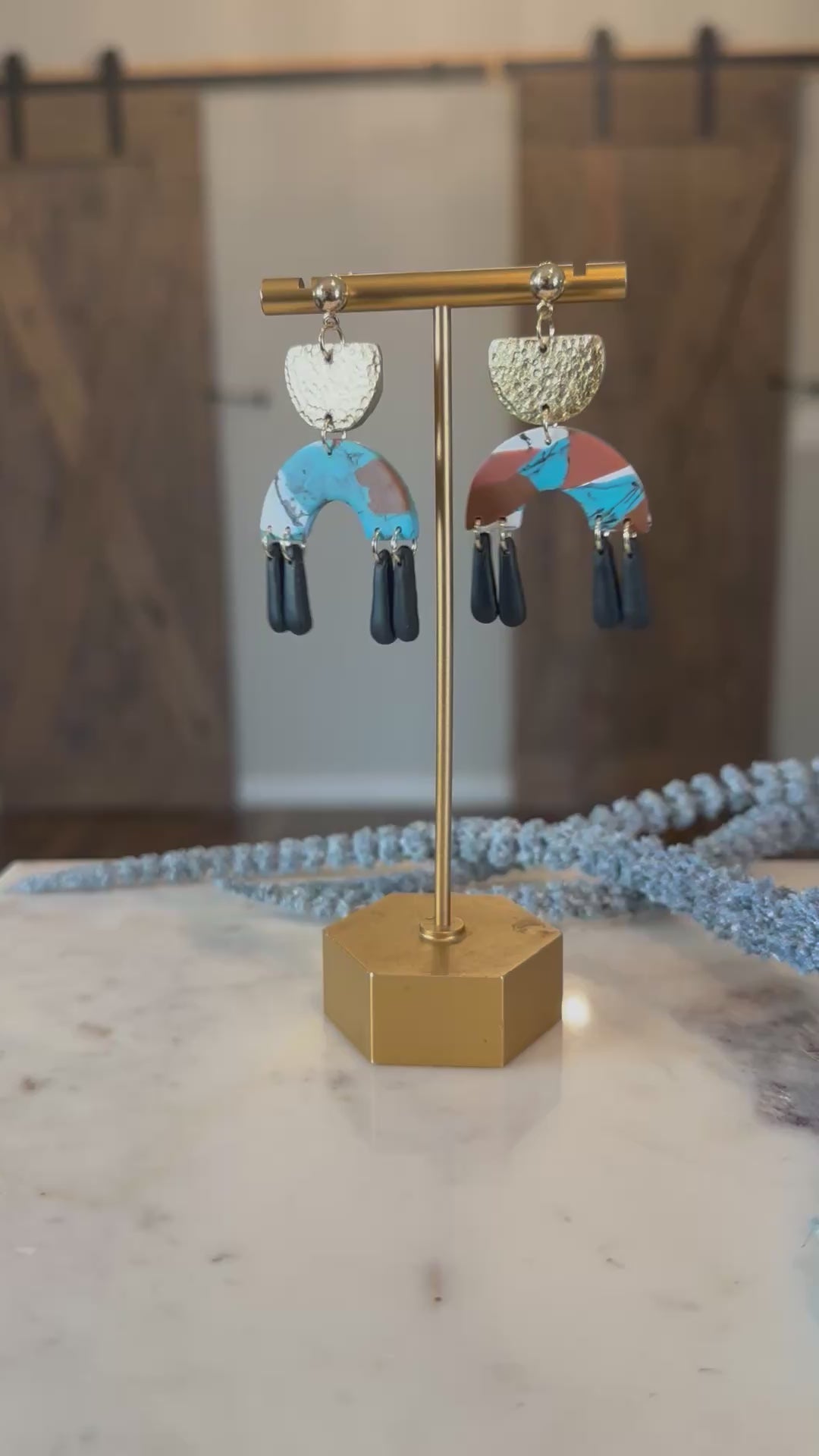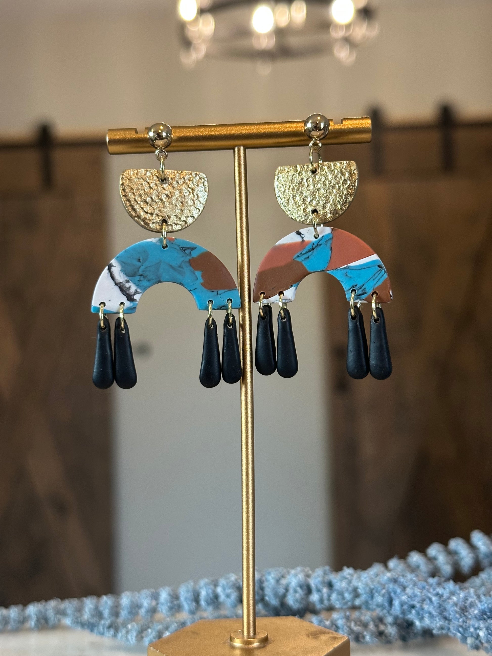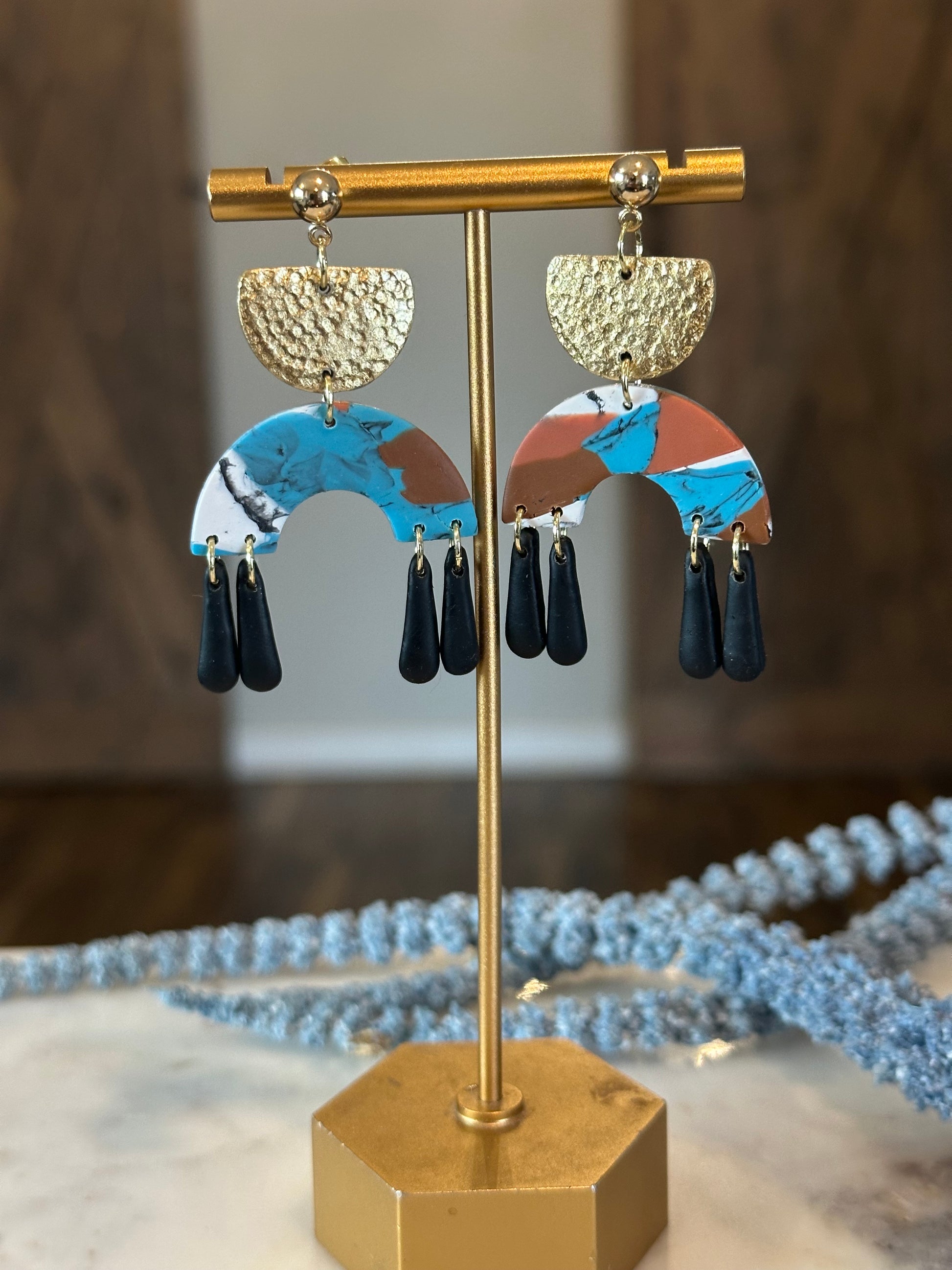 These Boho Arch Earrings feature an arch design with black dangles and a mix of turquoise, terracotta, and brown marble. The gold stud adds a beautiful accent to these statement earrings. Eye-catching and fun, they are perfect for everyday wear and will help you stand out with their boho style.