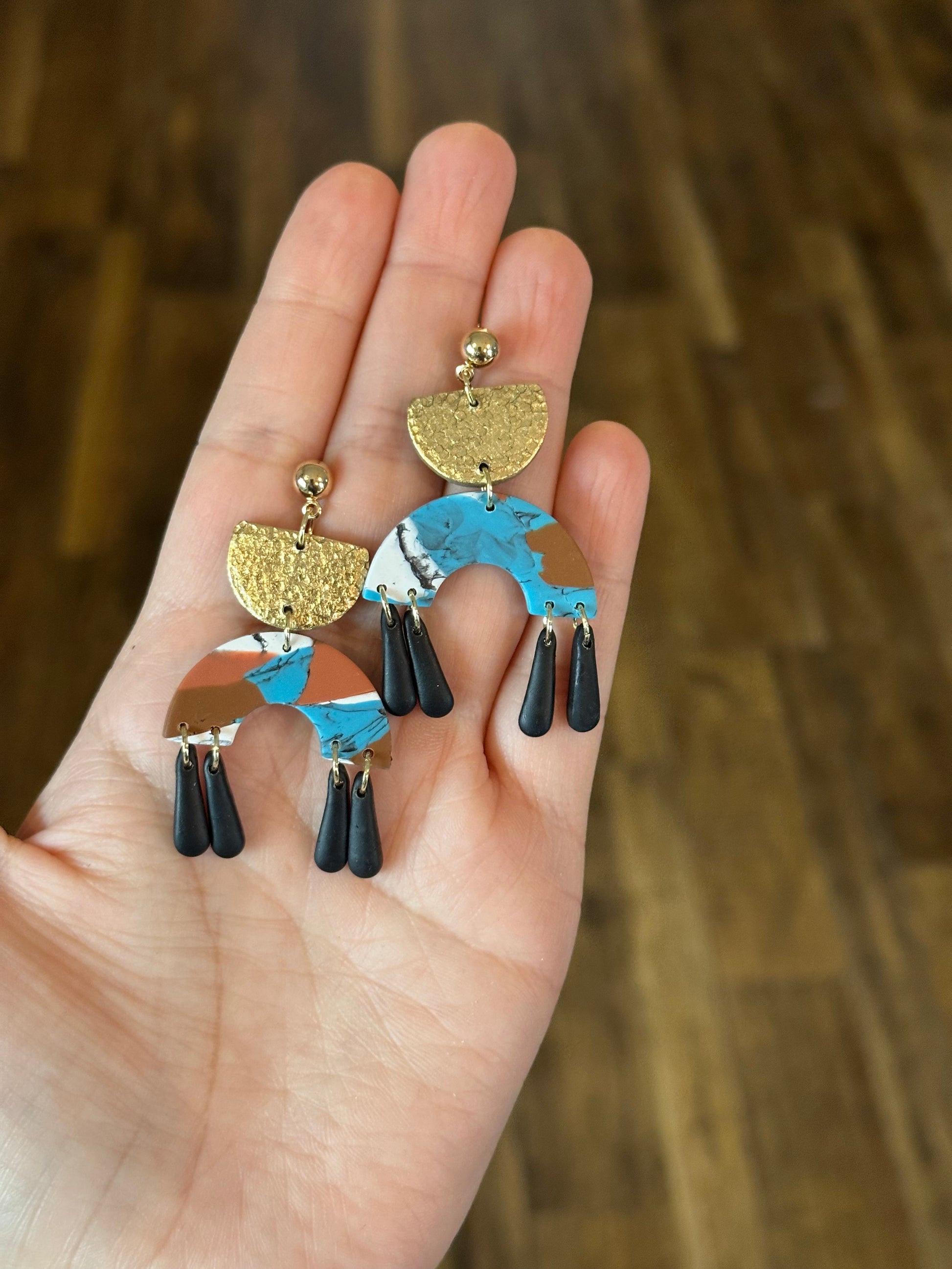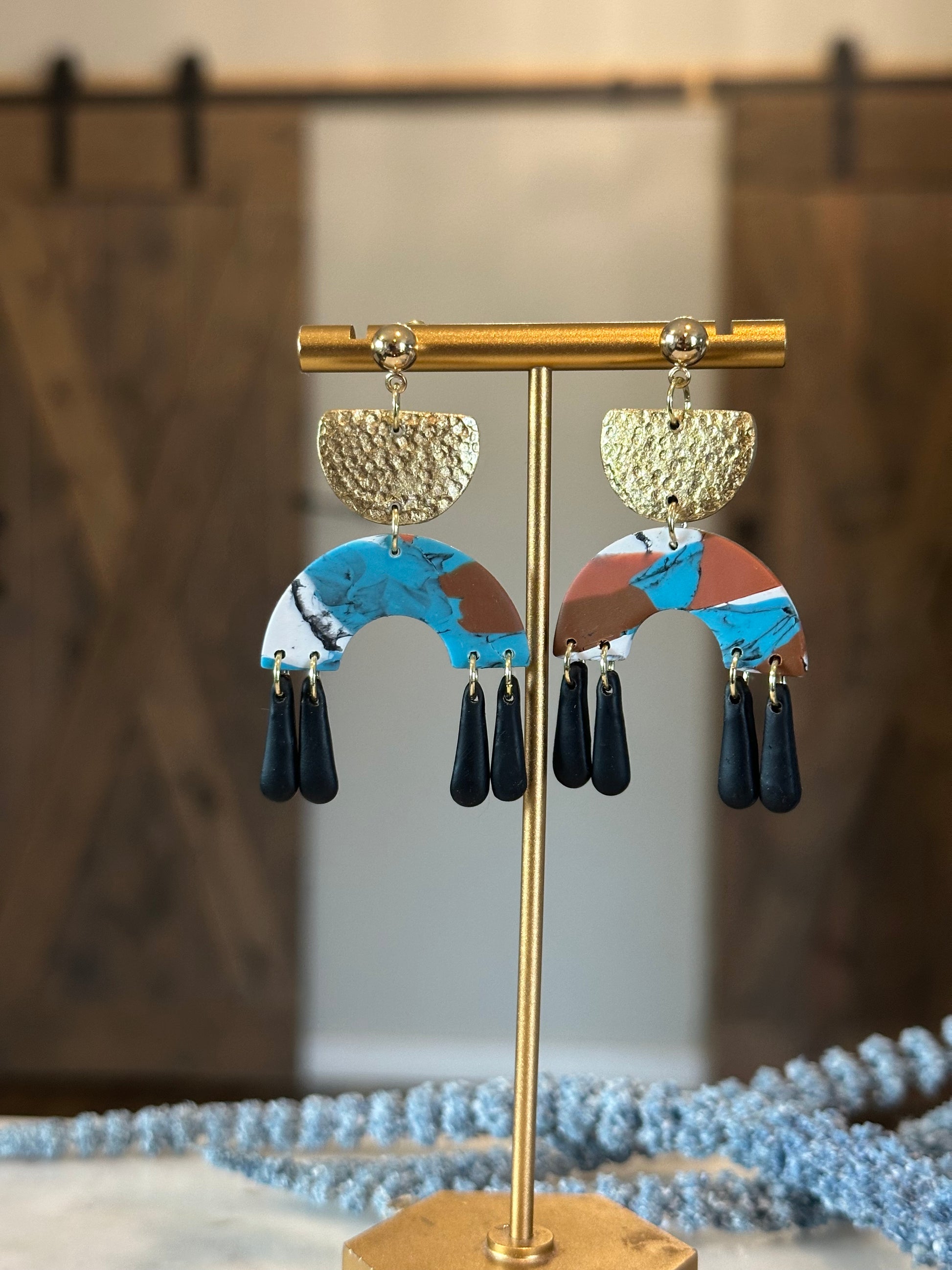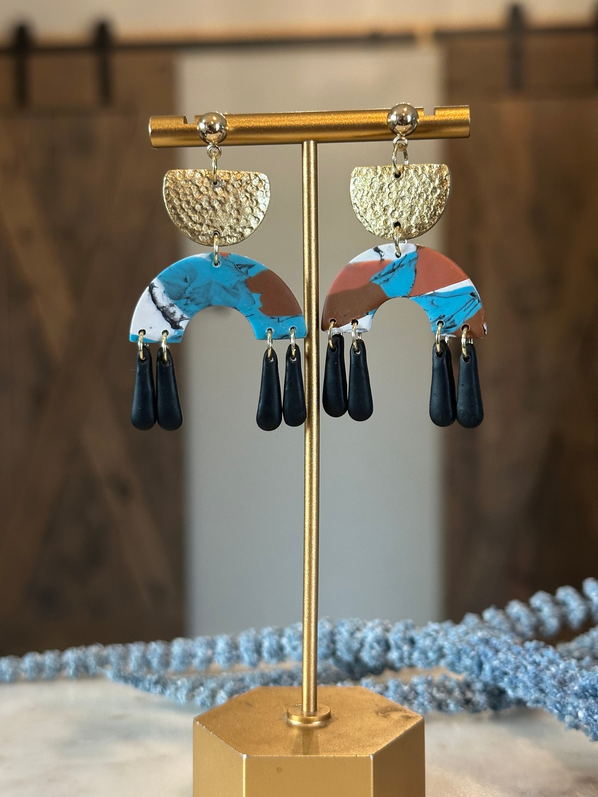 These Boho Arch Earrings feature an arch design with black dangles and a mix of turquoise, terracotta, and brown marble. The gold stud adds a beautiful accent to these statement earrings. Eye-catching and fun, they are perfect for everyday wear and will help you stand out with their boho style.