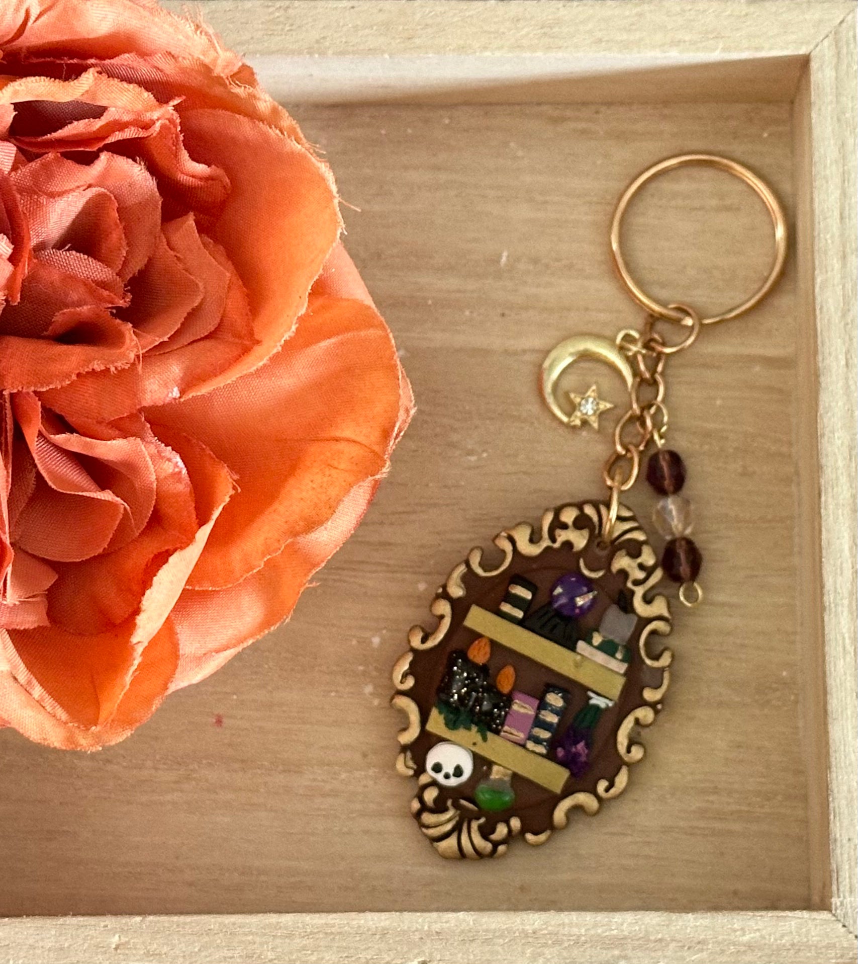 This Halloween Bookshelf Collection is a must-have for any book lover or lover of all things spooky. Its unique bookshelf design features a crystal ball, potions, and books, making it the perfect addition to your Halloween decor. Each piece, whether it be a keychain, bookmark, or lightweight earrings, has been carefully crafted by hand. Indulge your passion for books and Halloween with this one-of-a-kind collection.