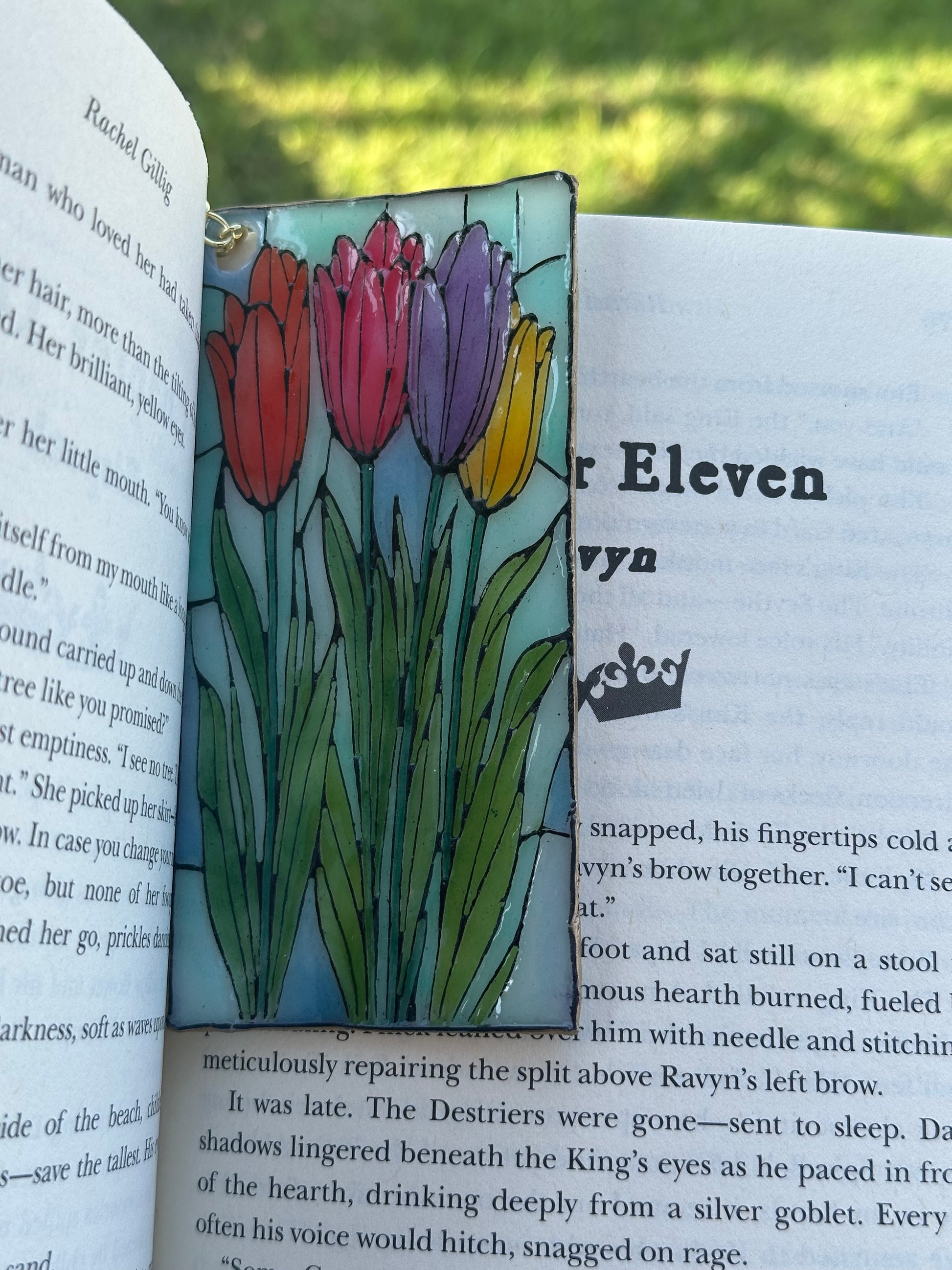 Bring a burst of color and elegance to your reading routine with this handmade Tulip Stained Glass Bookmark. Each bookmark is carefully crafted from translucent polymer clay, hand-colored, and sealed in a durable, glossy resin finish. The result? A stained-glass effect that catches the light beautifully β€” like a tiny work of art tucked between your pages.