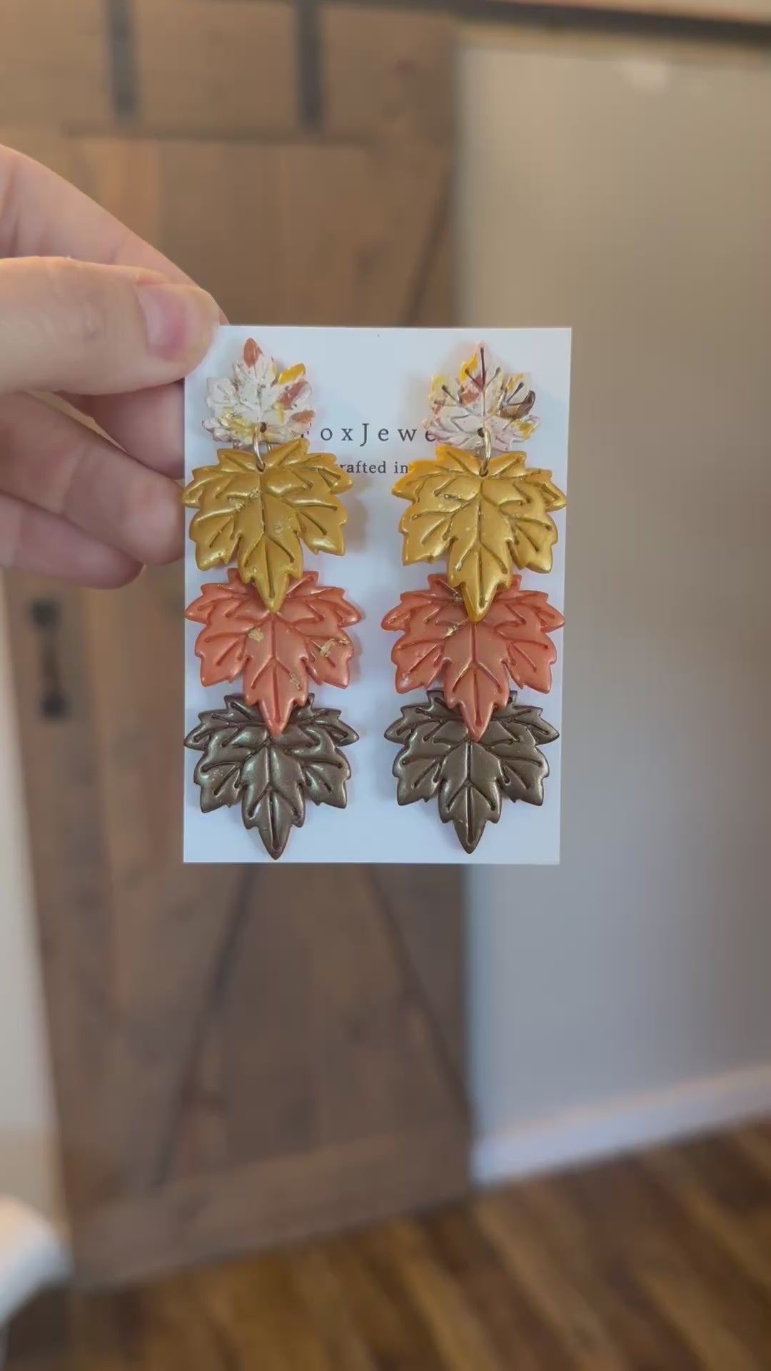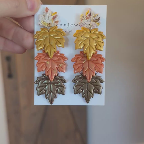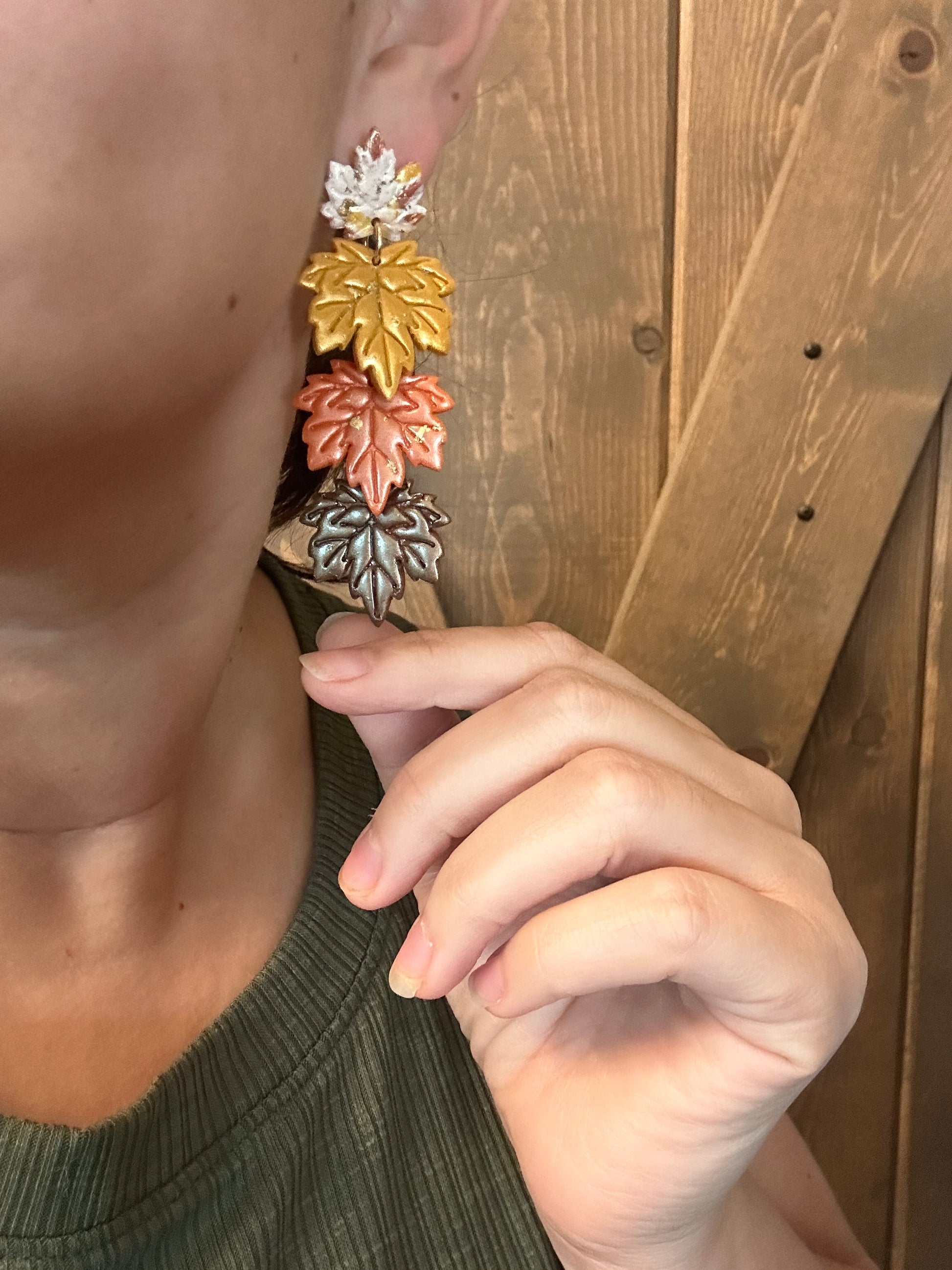 Bring the beauty of fall to your style with these handcrafted stacked maple leaf earrings. Featuring layers of golden yellow, burnt orange, and deep brown leaves with hints of gold foil, these statement earrings are perfect for autumn lovers. Lightweight and bold, they’re designed to turn heads while staying comfortable for all-day wear.