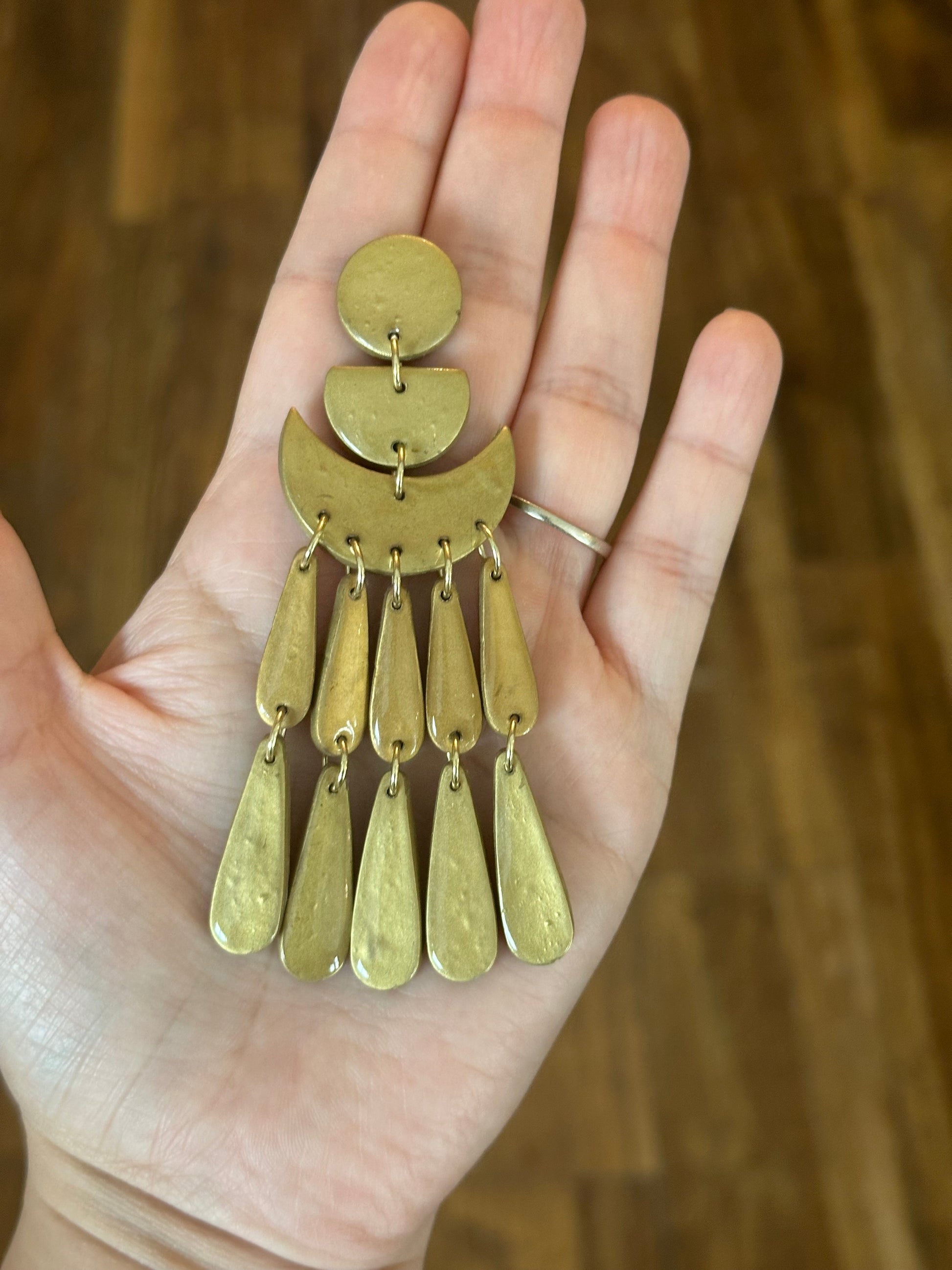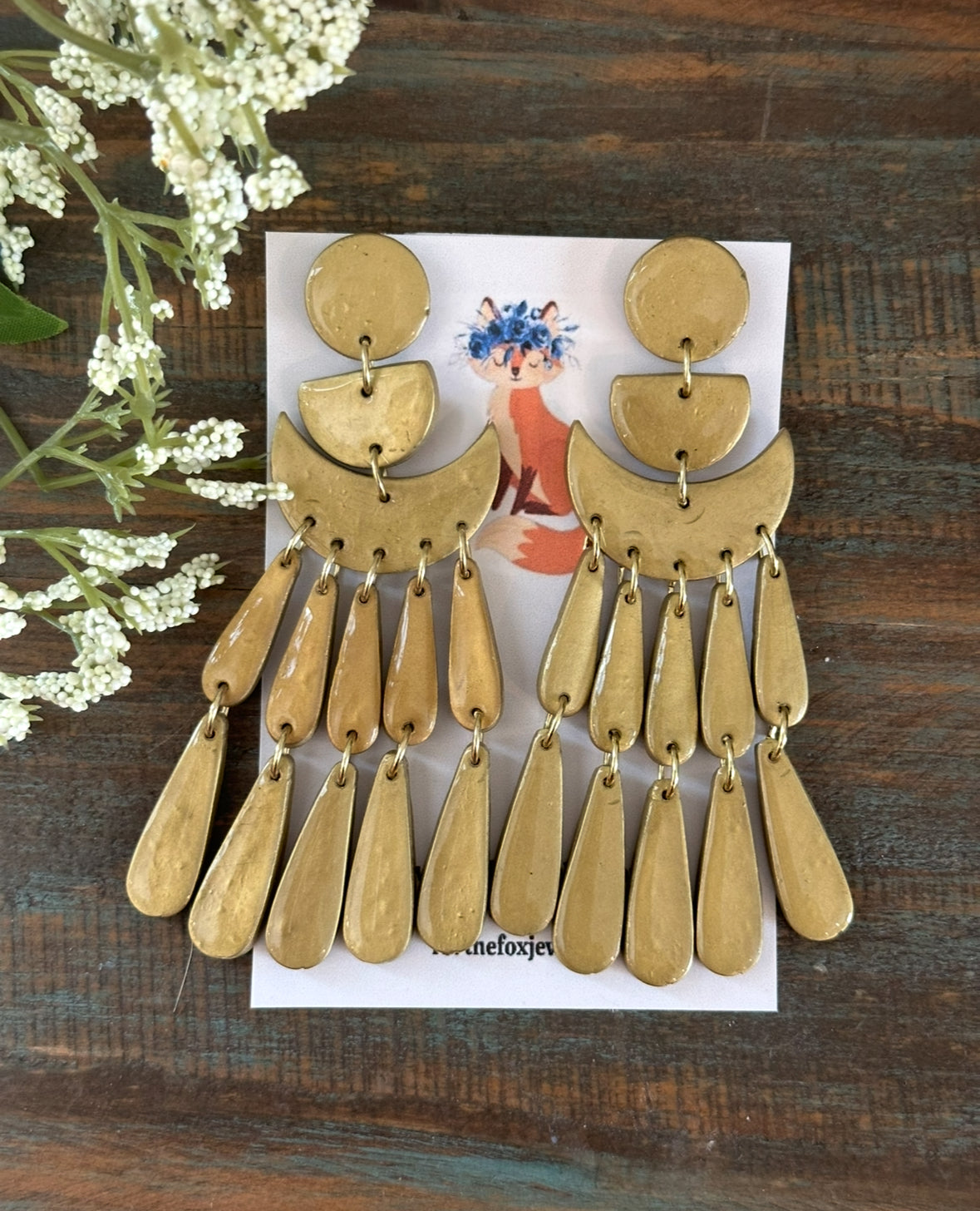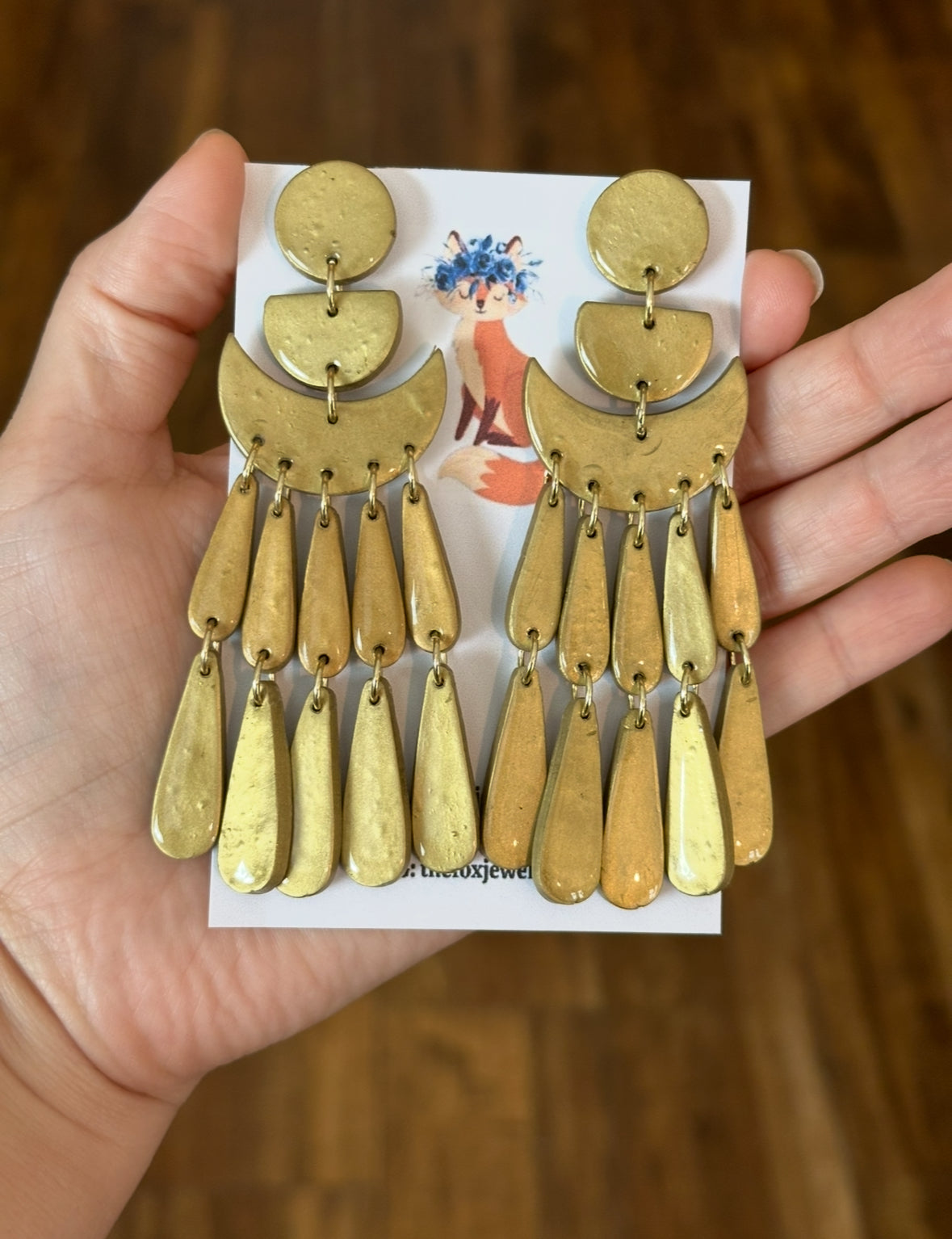 These bold Gold chandelier earrings are a glamorous addition to any special event outfit. Handmade with an iridescent shimmer, they are both elegant and lightweight. Perfect for a touch of glamour, these large dangle earrings will make a statement at any occasion. Check out our other color options or contact me for a custom color!