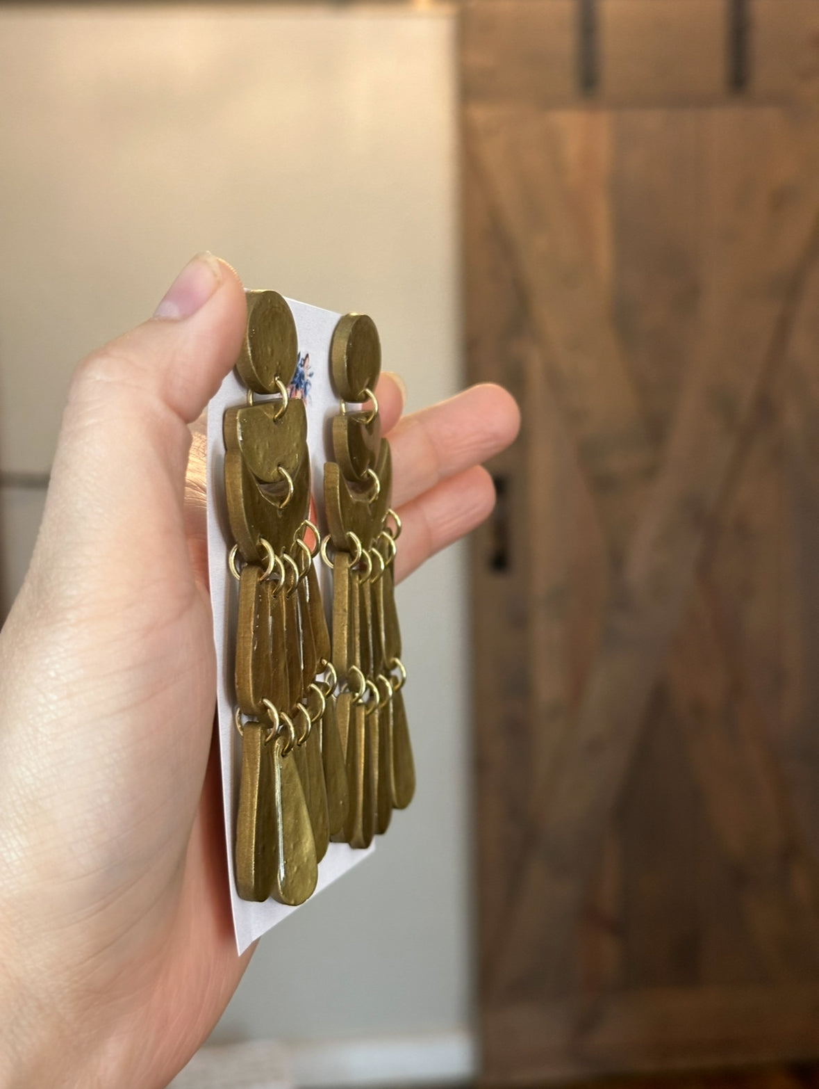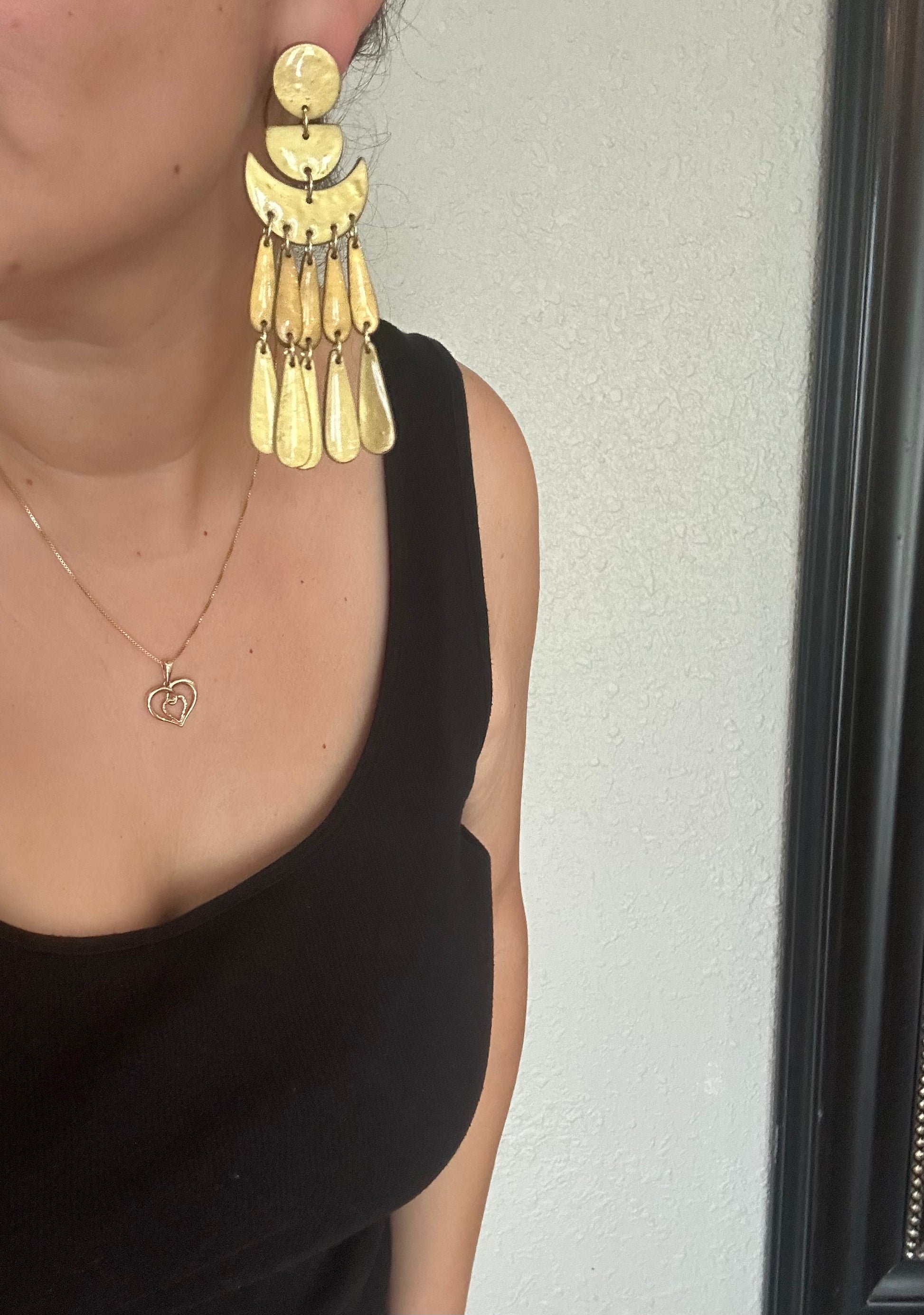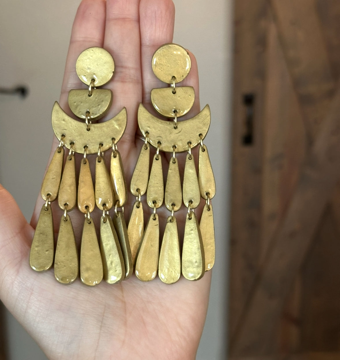 These bold Gold chandelier earrings are a glamorous addition to any special event outfit. Handmade with an iridescent shimmer, they are both elegant and lightweight. Perfect for a touch of glamour, these large dangle earrings will make a statement at any occasion. Check out our other color options or contact me for a custom color!