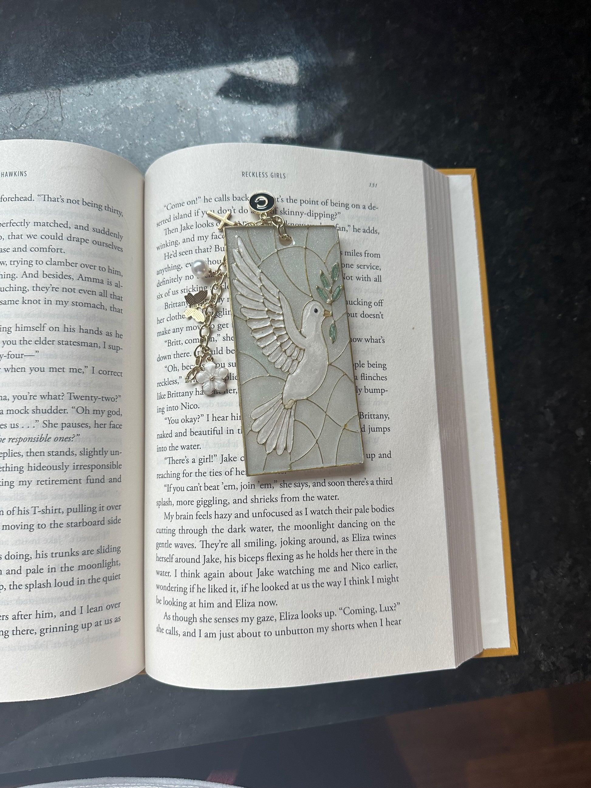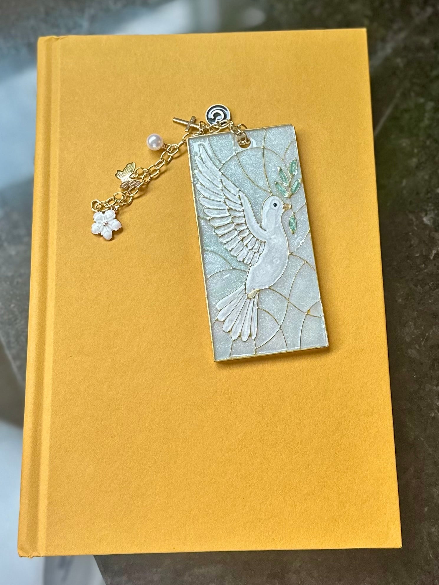 Handmade Dove Bookmark – Stained Glass-Inspired Polymer Clay with Gold Charms