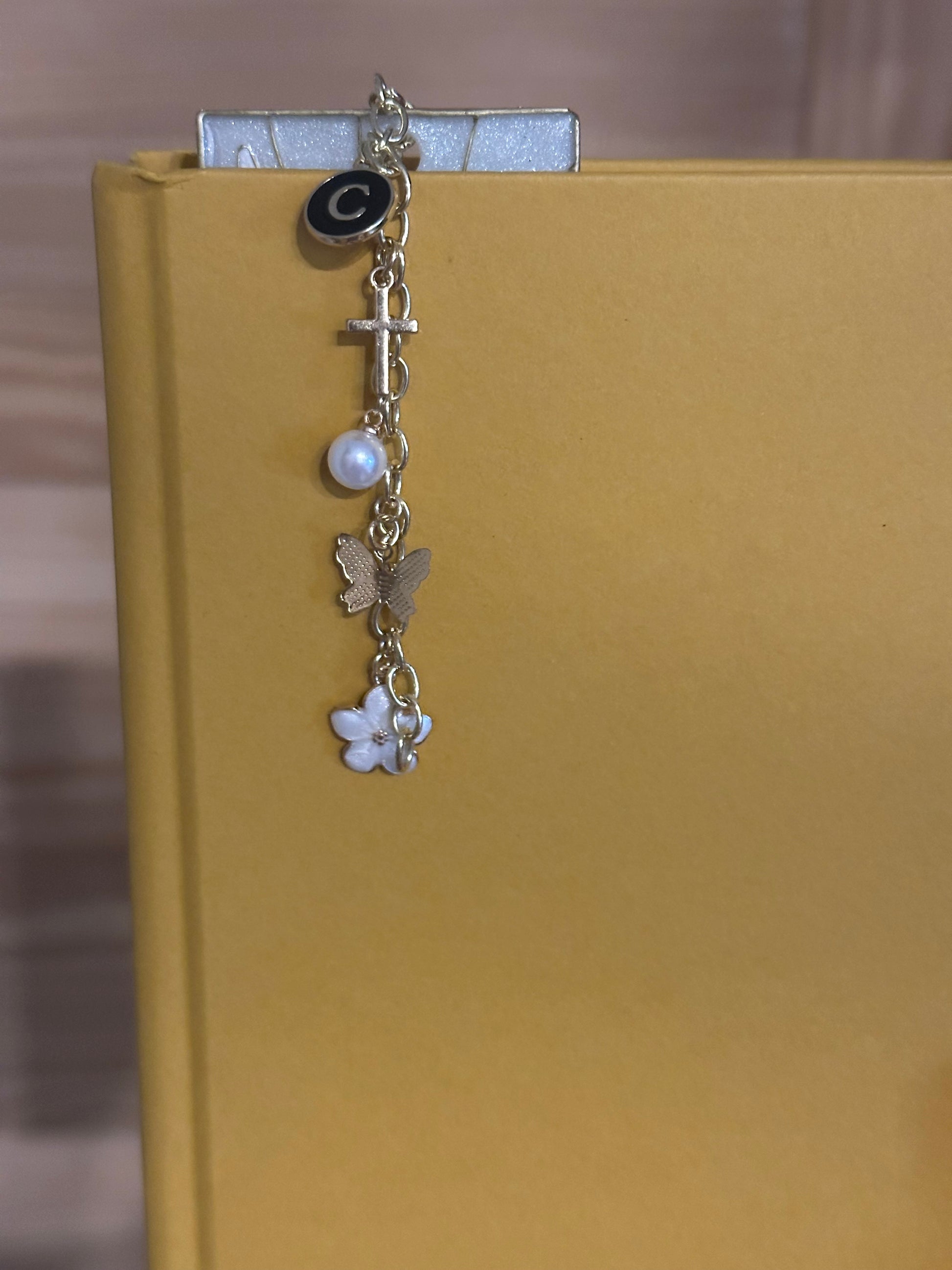 Each bookmark is carefully handcrafted, so while colors are matched closely to the original, every piece is one-of-a-kind. A gold-tone chain hangs from the base, adorned with five gold charms (styles may vary). You can also choose to add a personalized initial charm for an additional charge — making this a thoughtful gift for baptisms, confirmations, or anyone growing in their faith.