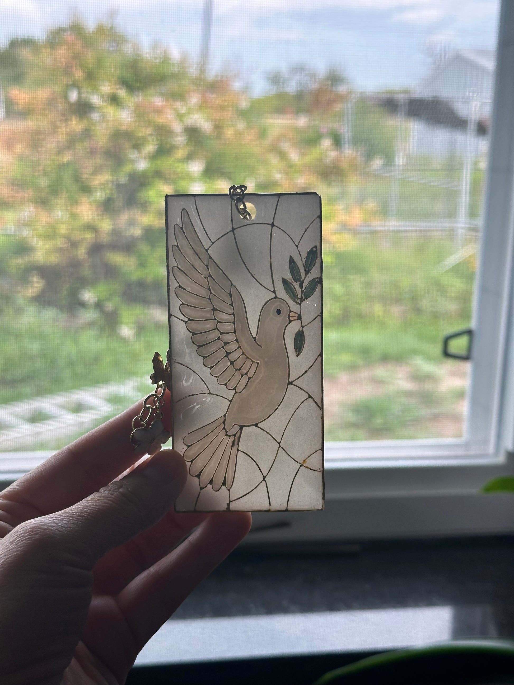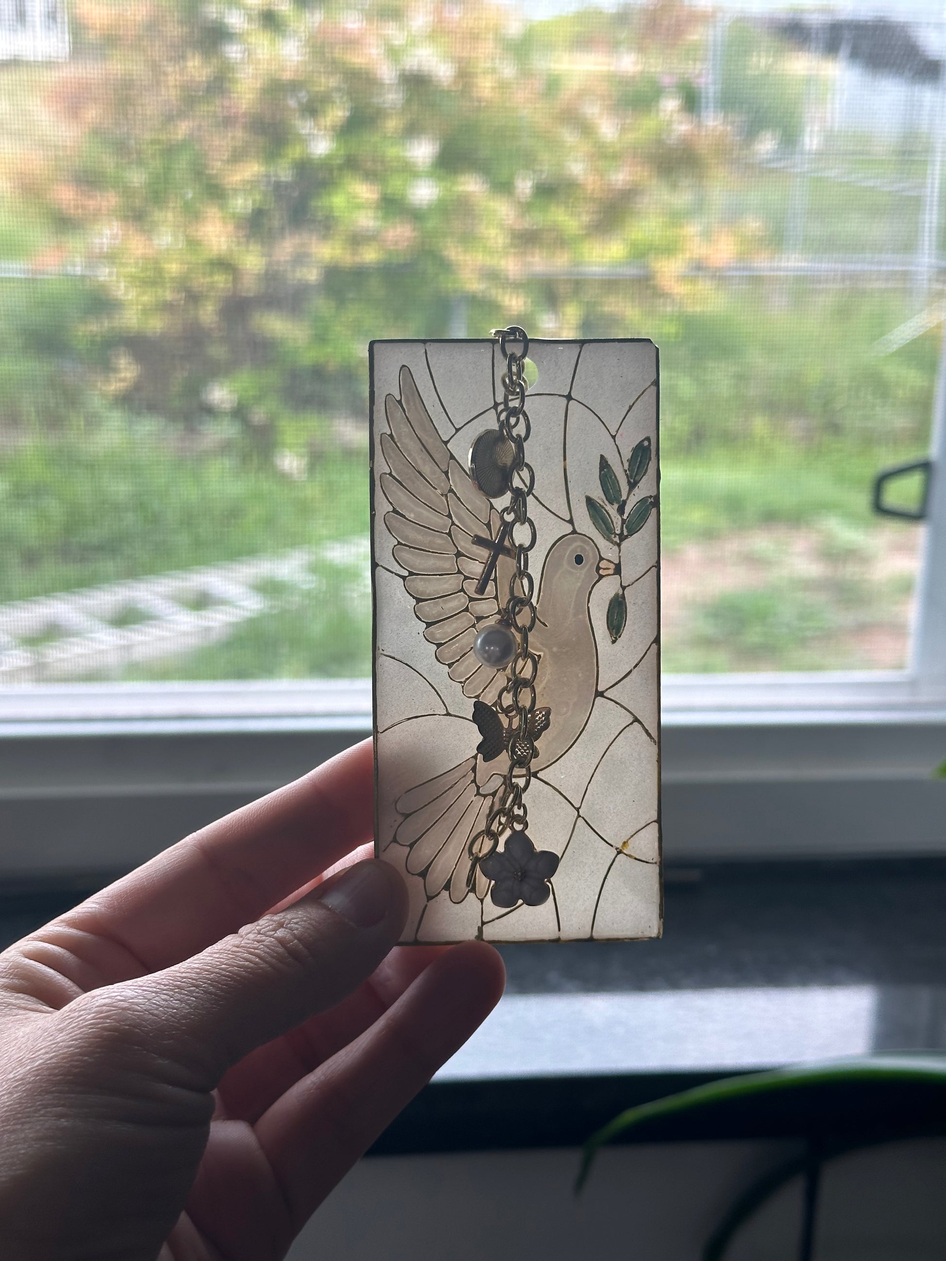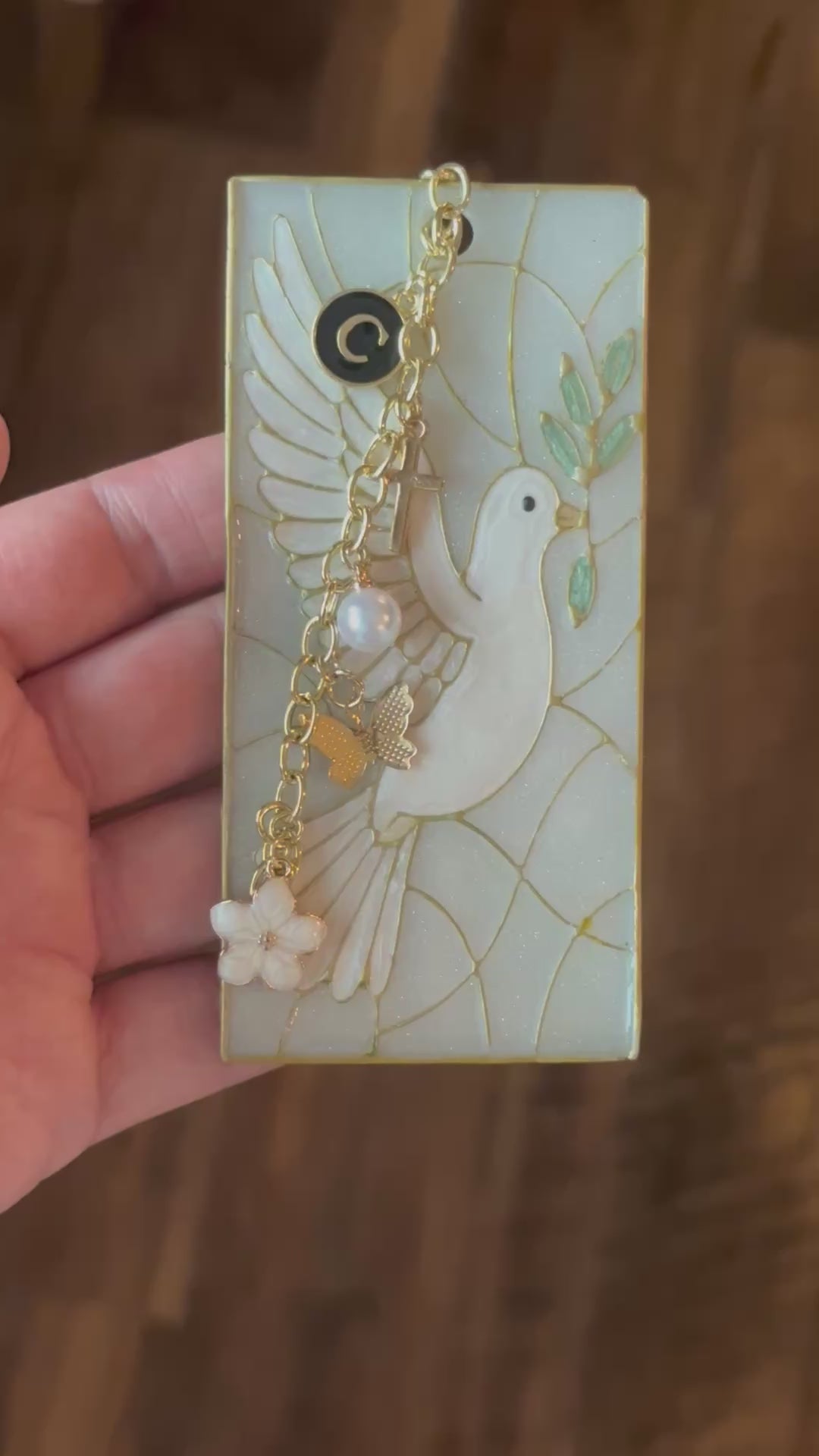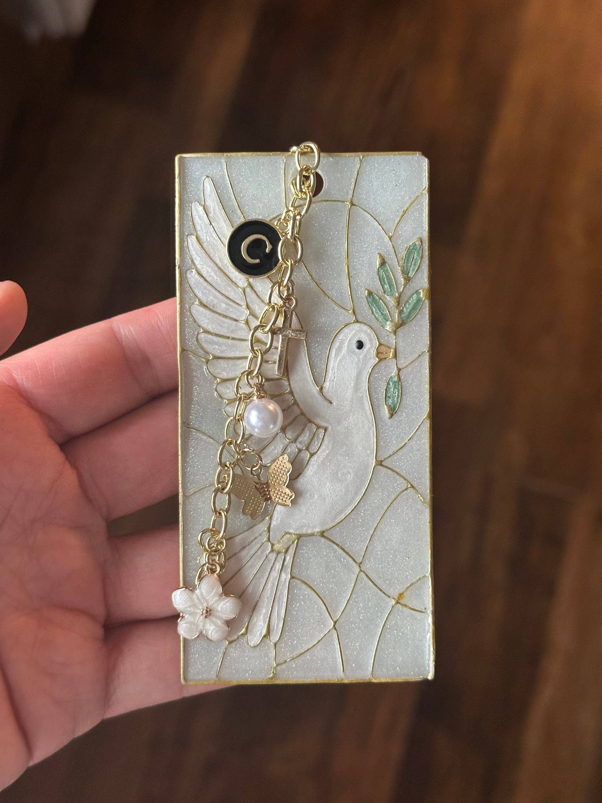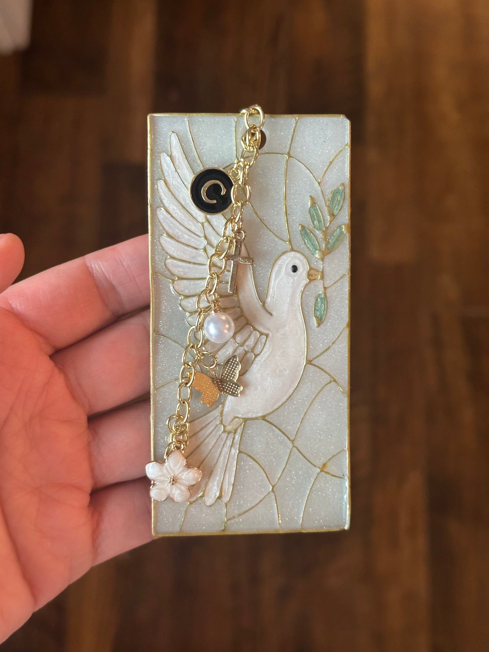 A beautiful symbol of peace, faith, and renewal, this handmade polymer clay bookmark features a white shimmery dove holding a leafy branch, set against a soft green background. The design is inspired by stained glass artwork — with the delicate look of glass, but crafted entirely from polymer clay and sealed with resin for strength.