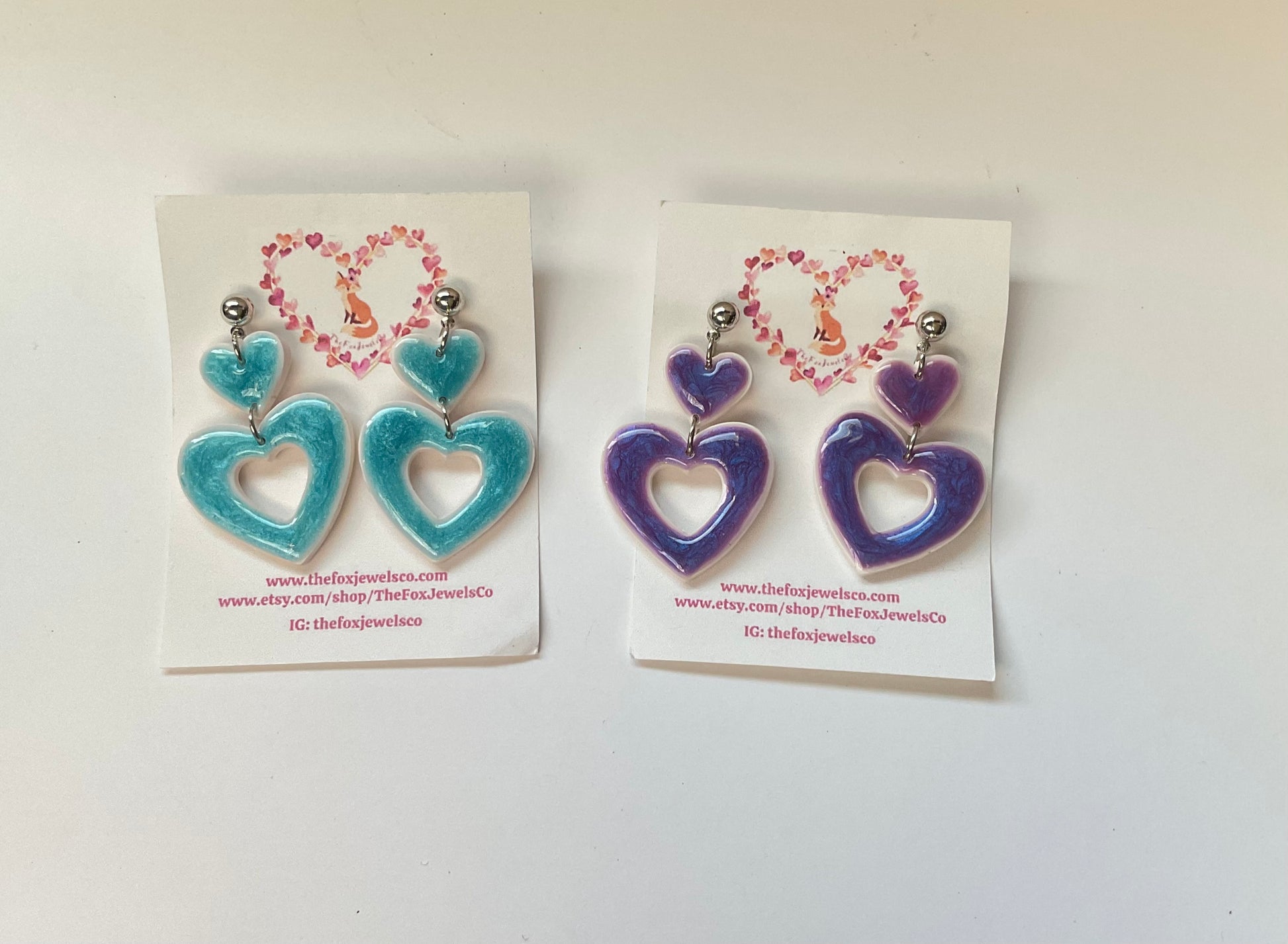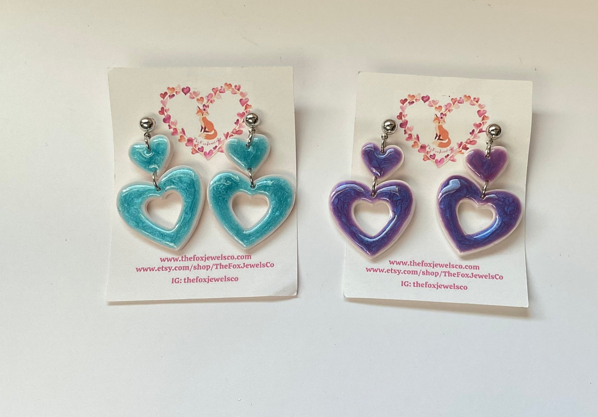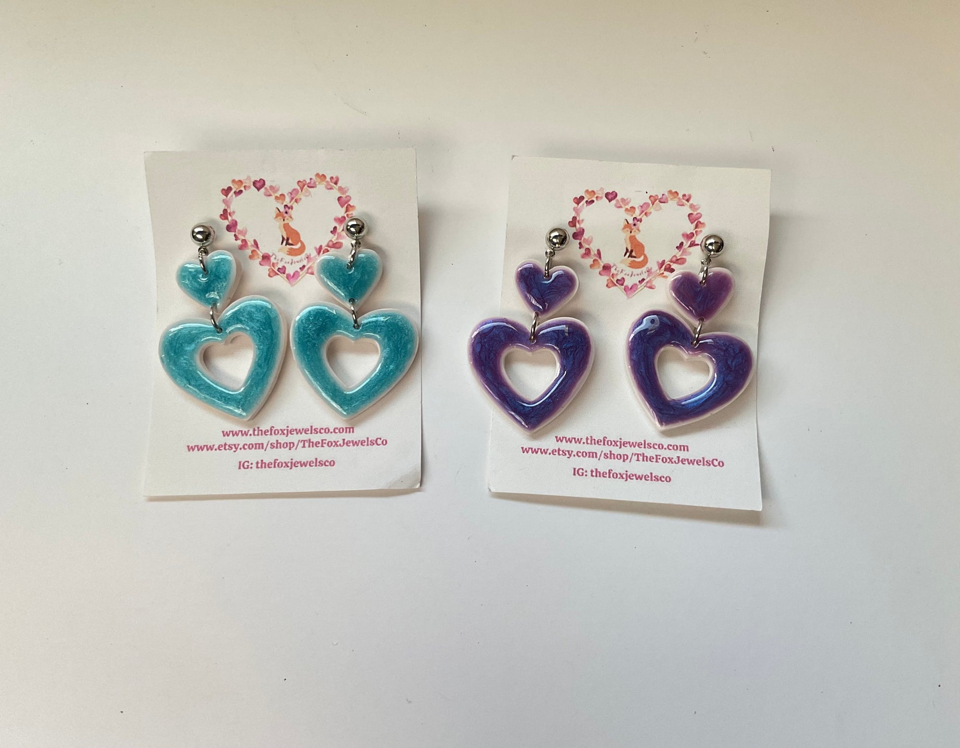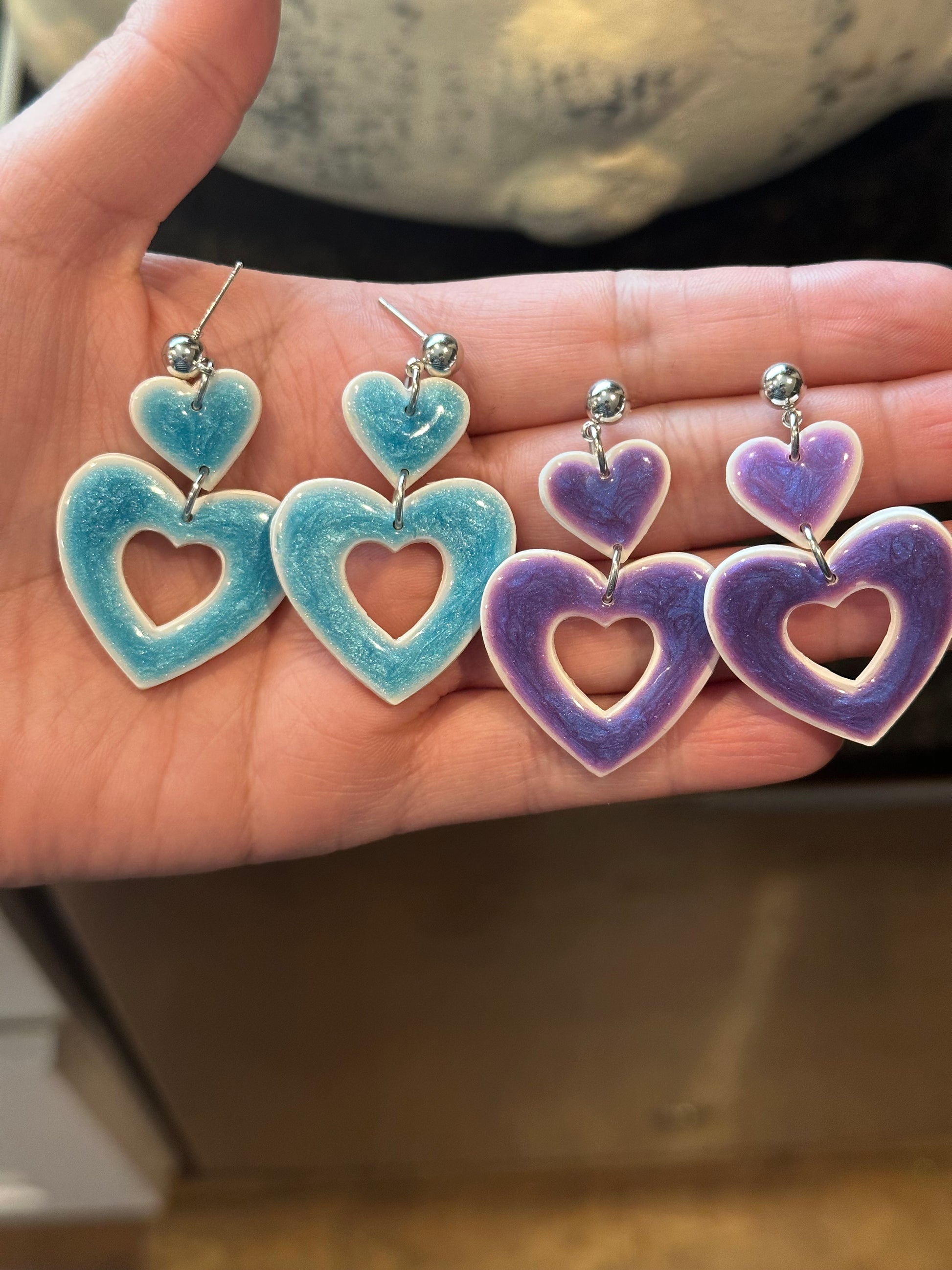 These unique Heart Earrings are expertly crafted with the ceramic method paint and shimmer resin, resulting in a one-of-a-kind accessory. Choose from blue or purple to add a touch of romance to any outfit. Perfect for Valentine's Day or any special occasion.