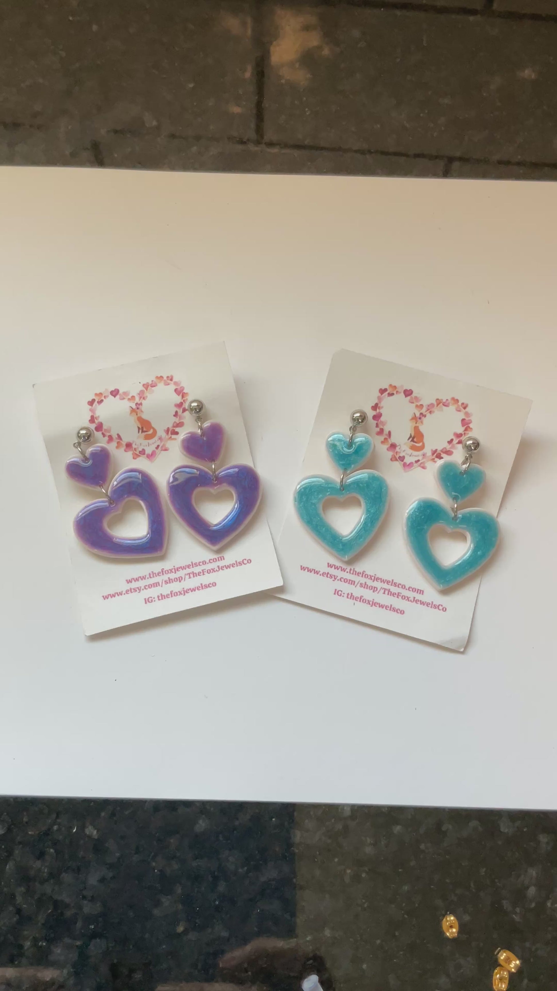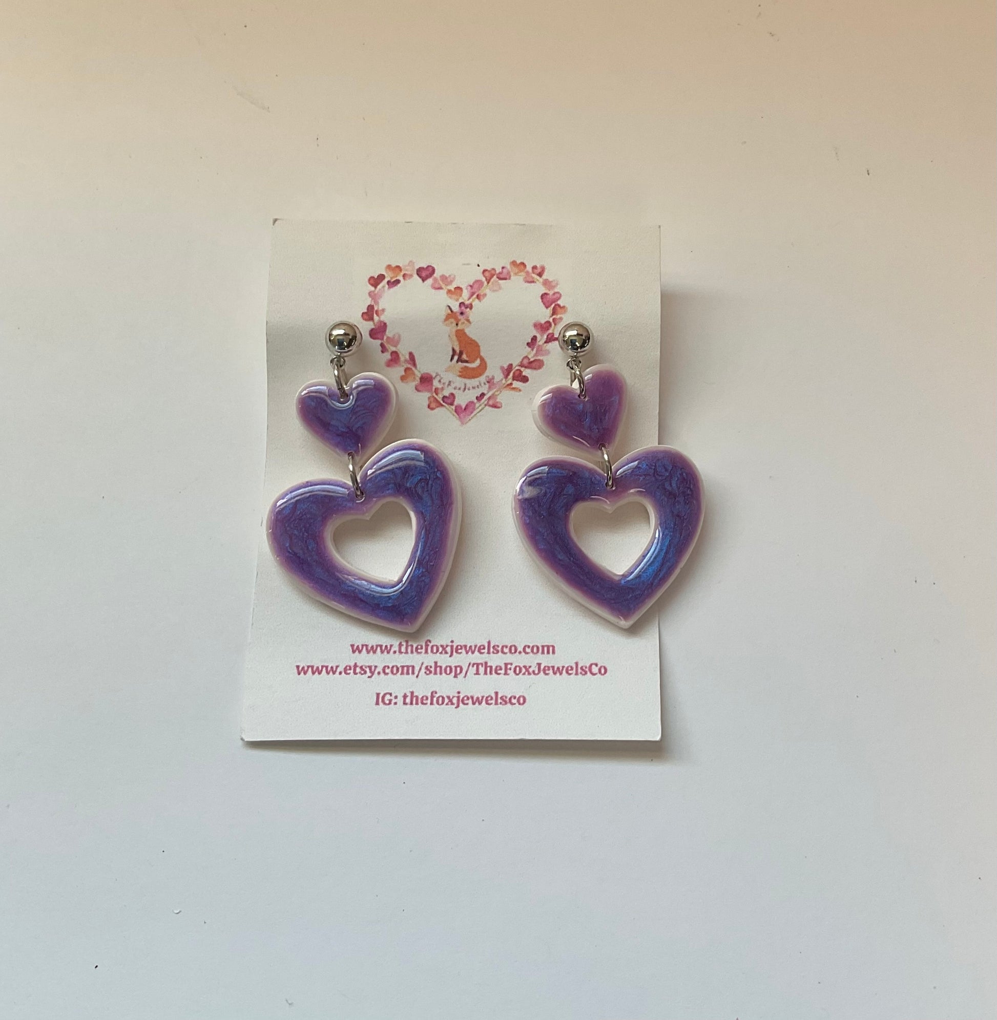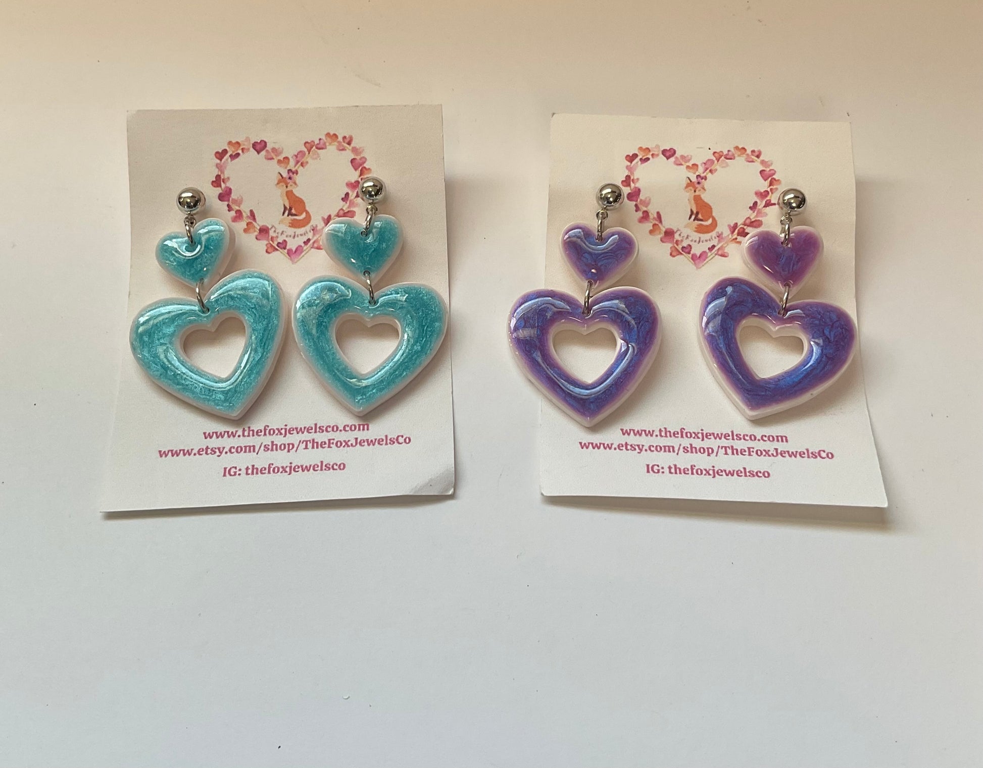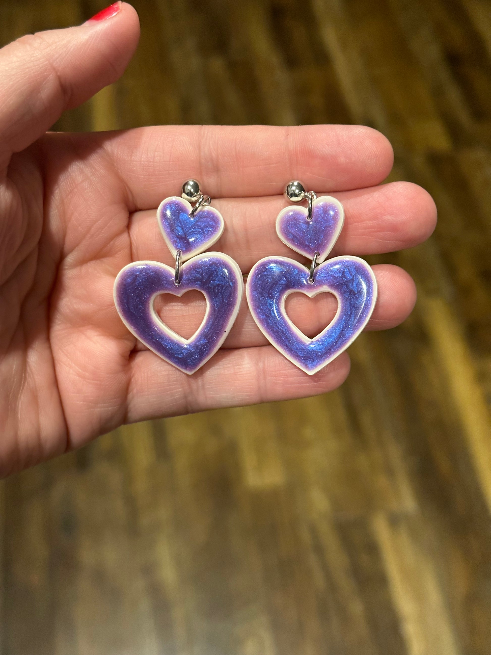 These unique Heart Earrings are expertly crafted with the ceramic method paint and shimmer resin, resulting in a one-of-a-kind accessory. Choose from blue or purple to add a touch of romance to any outfit. Perfect for Valentine's Day or any special occasion.