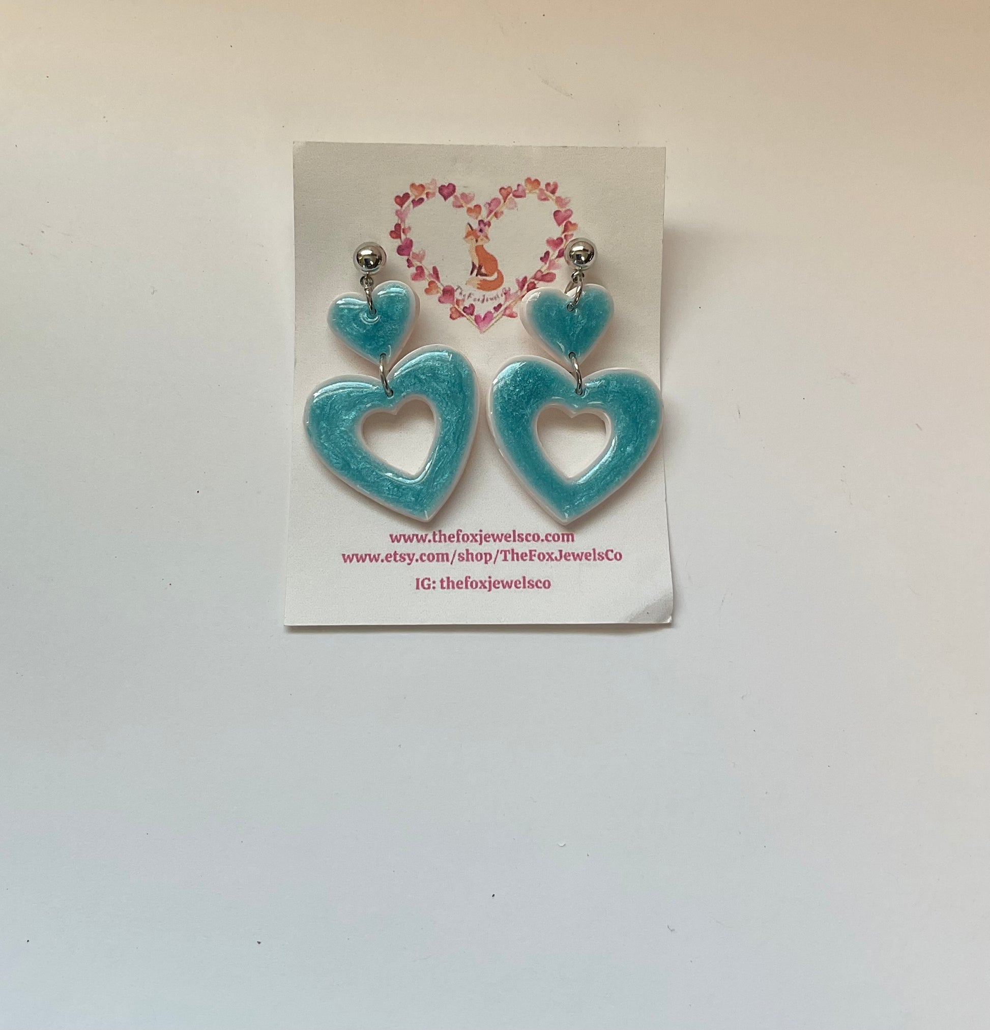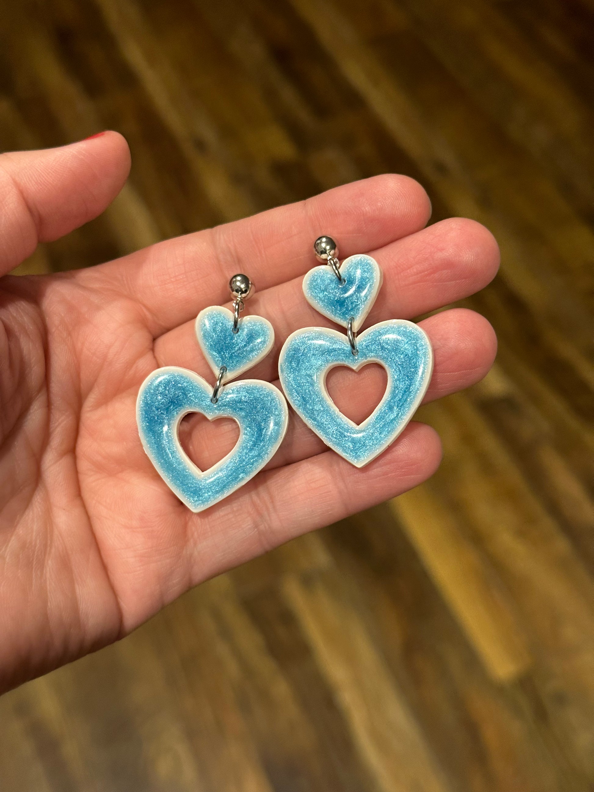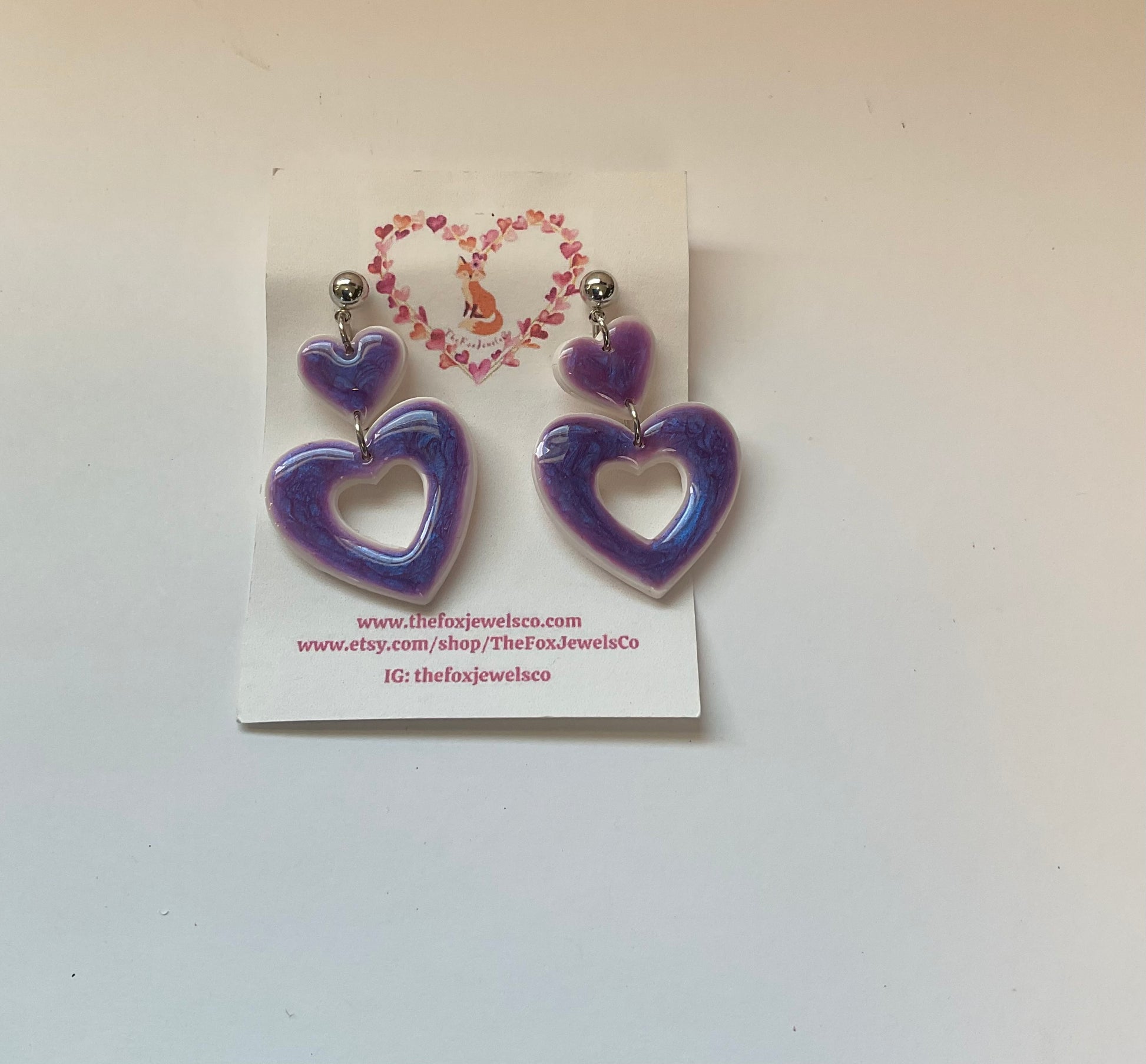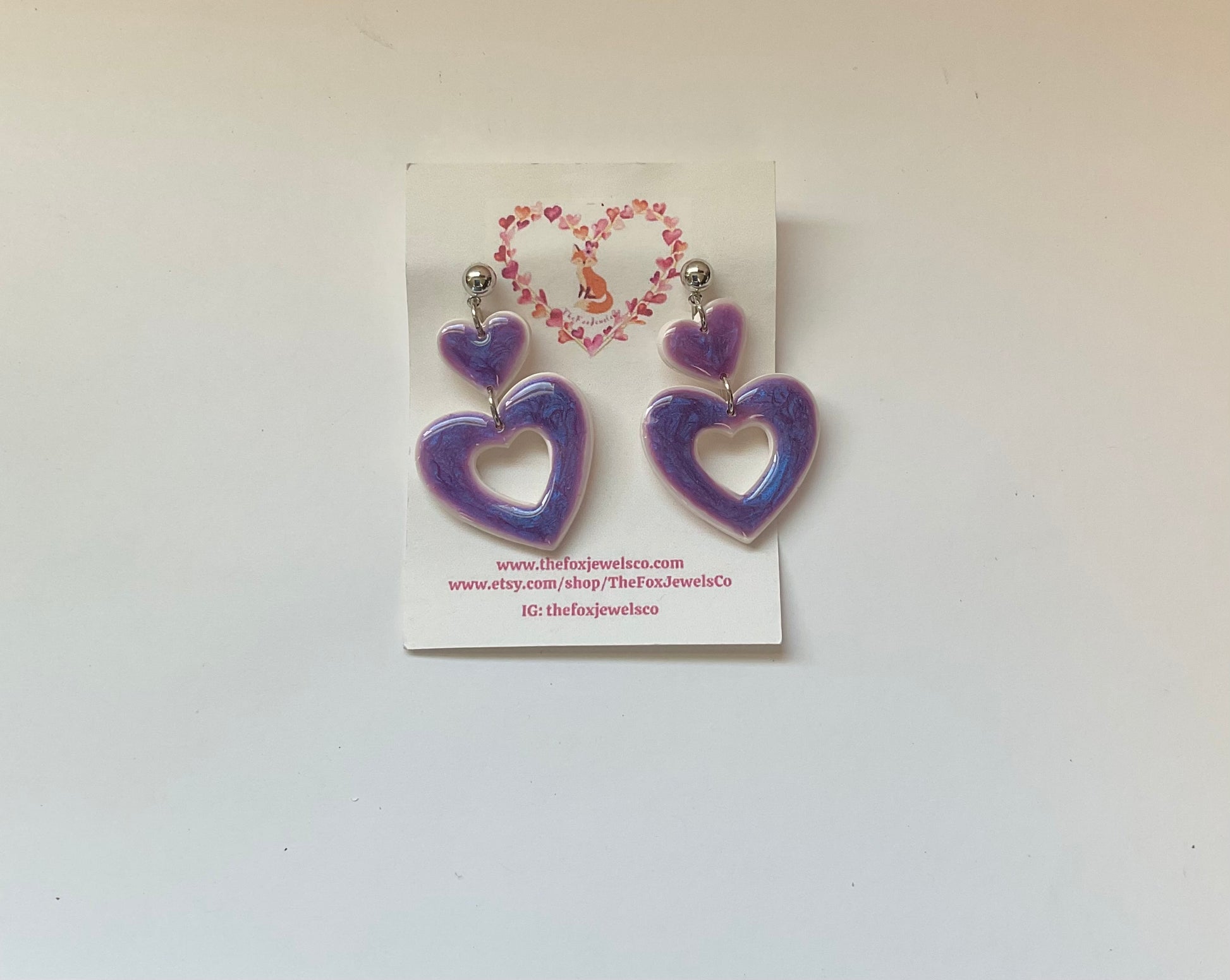 These unique Heart Earrings are expertly crafted with the ceramic method paint and shimmer resin, resulting in a one-of-a-kind accessory. Choose from blue or purple to add a touch of romance to any outfit. Perfect for Valentine's Day or any special occasion.