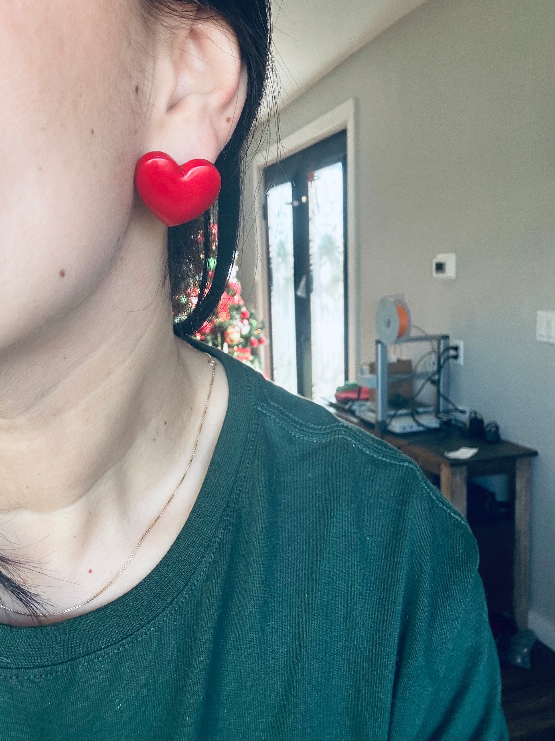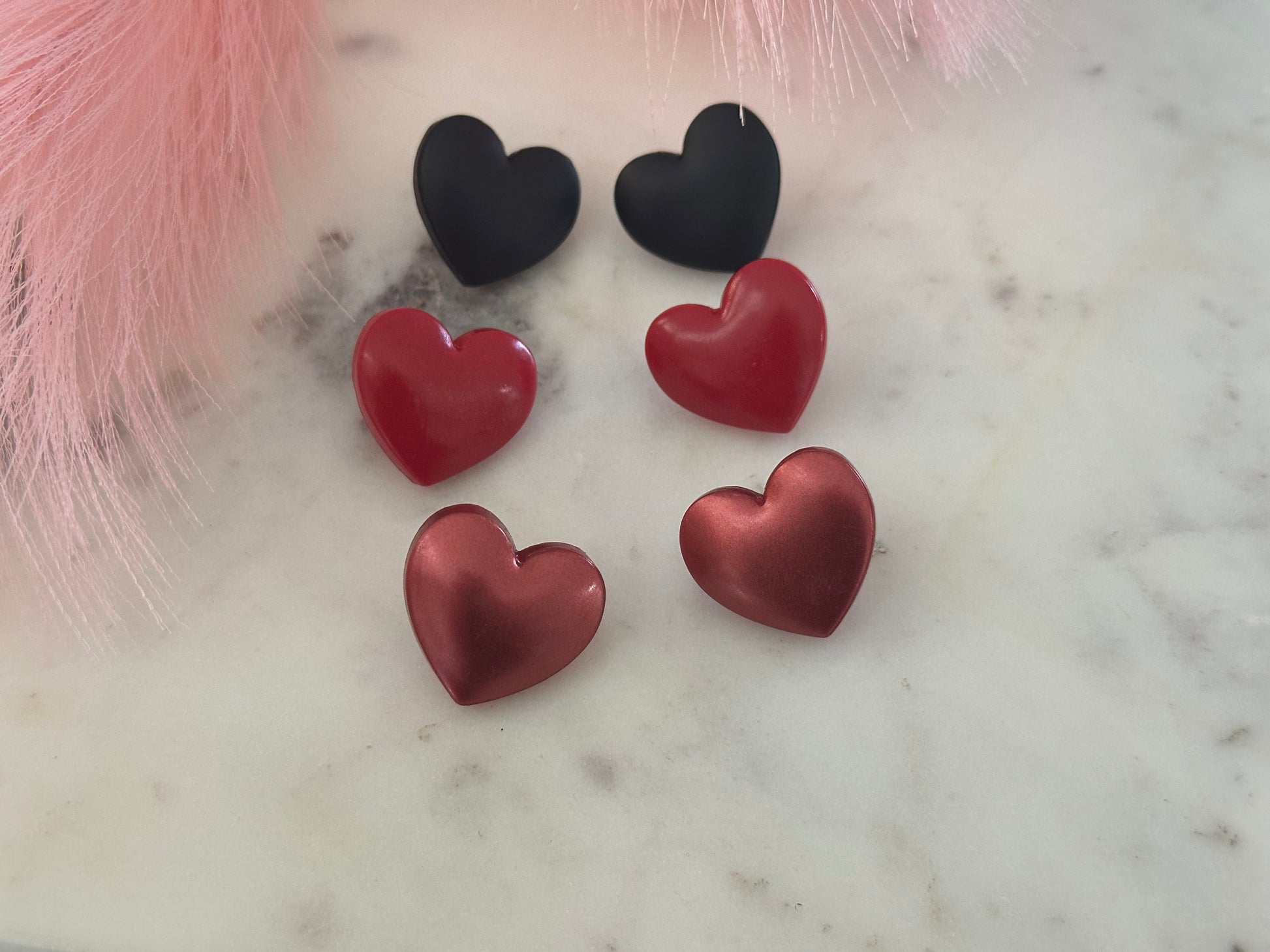 Upgrade your accessory game with our Puffy Heart Studs. These 3d clay earrings provide a unique and lightweight option that will make a statement. Choose between versatile black, bold red, or stunning metallic red. With a large size and puffy heart design, these studs are sure to elevate any outfit.
