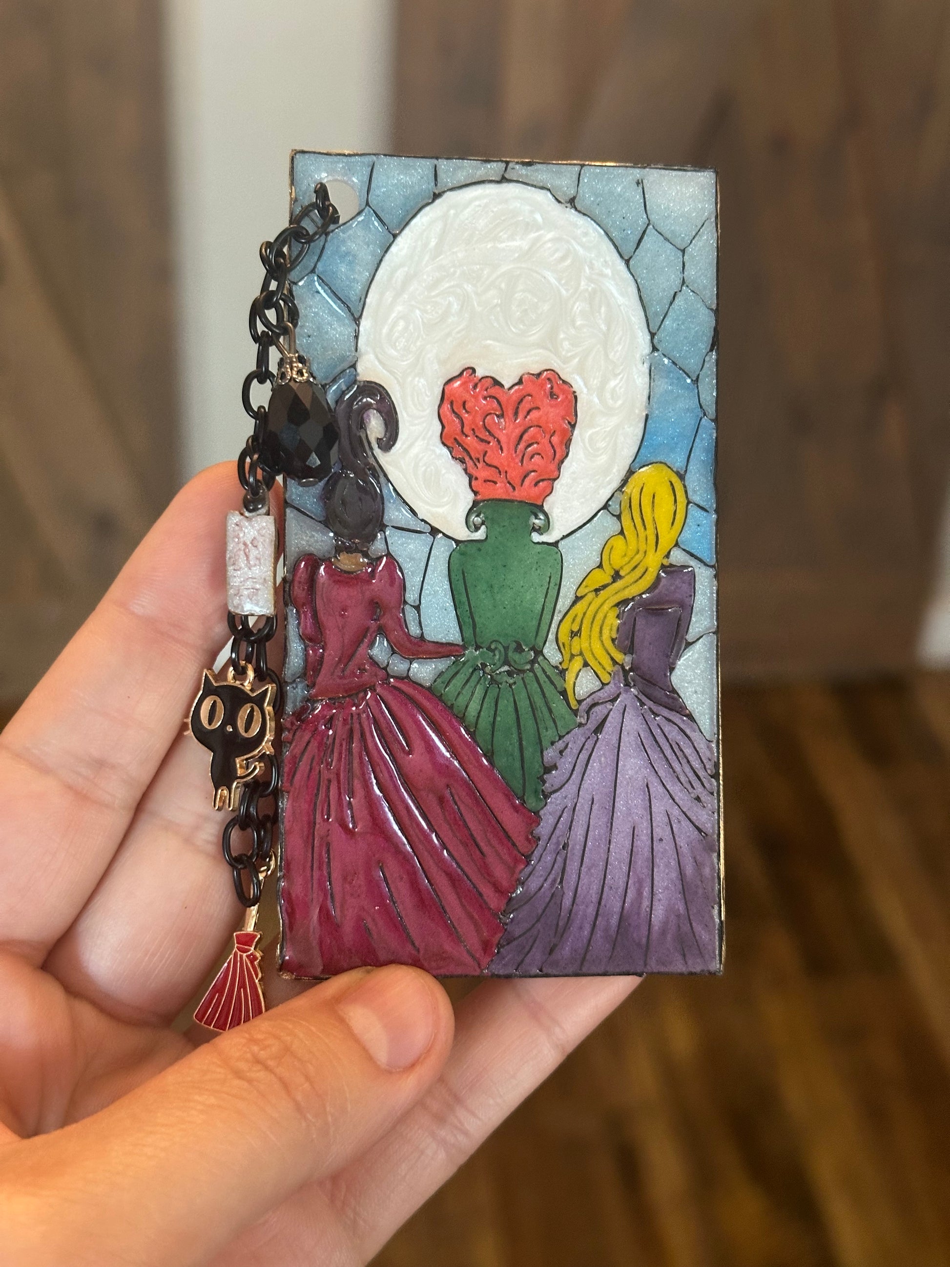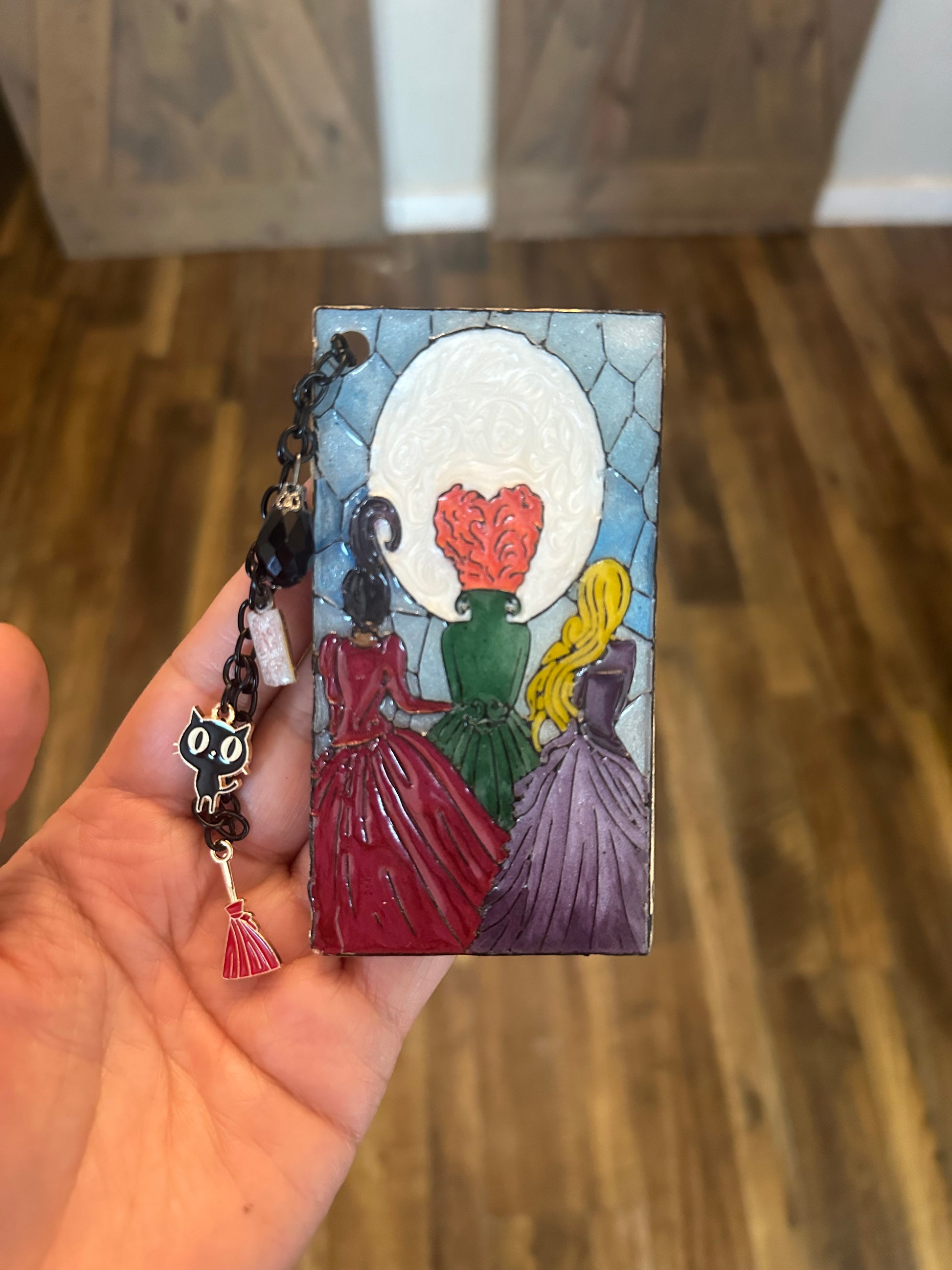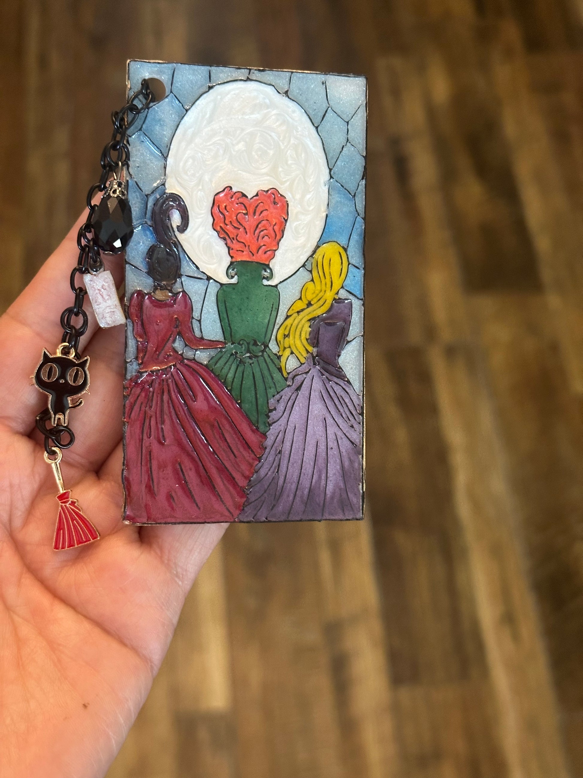 Sanderson Sisters Stained Glass-Inspired Polymer Clay Bookmark – Handmade with Charms & Black Flame Candle