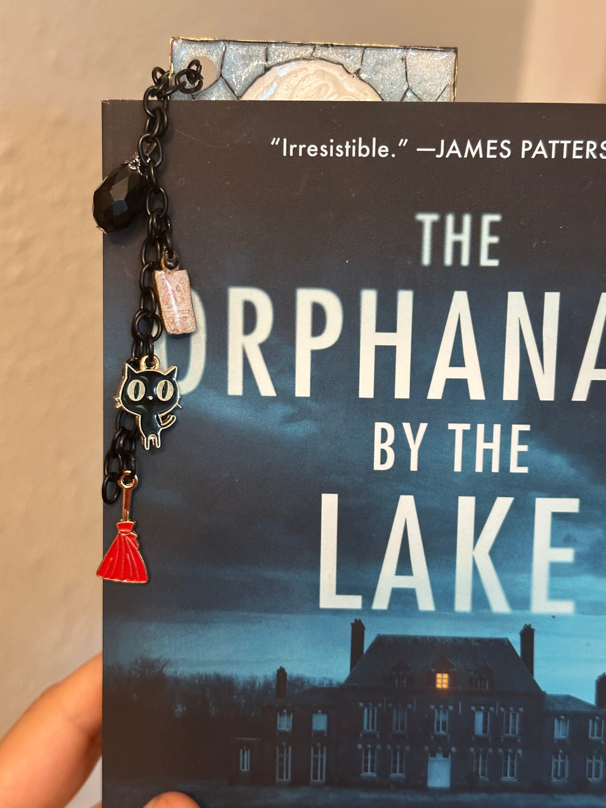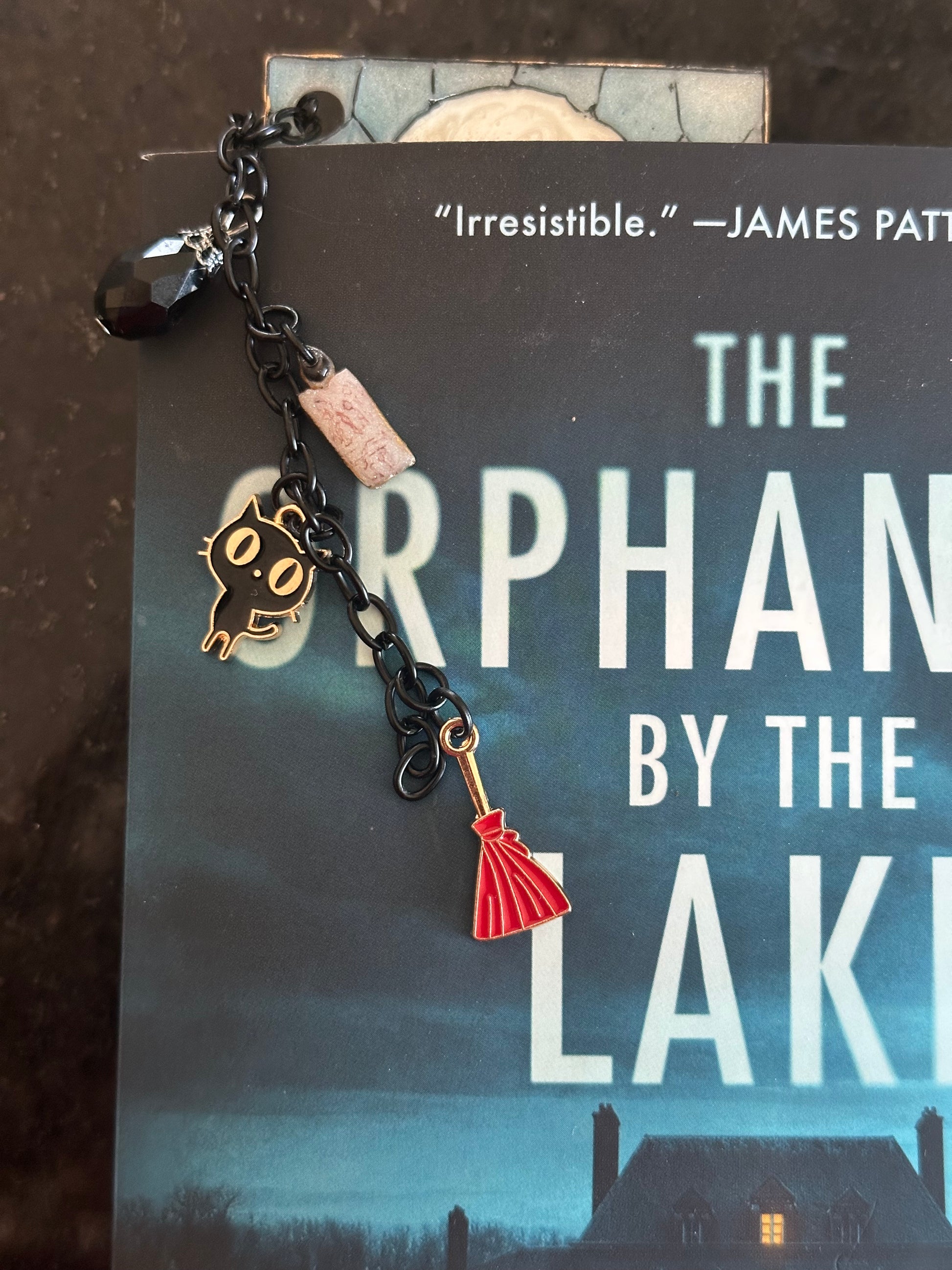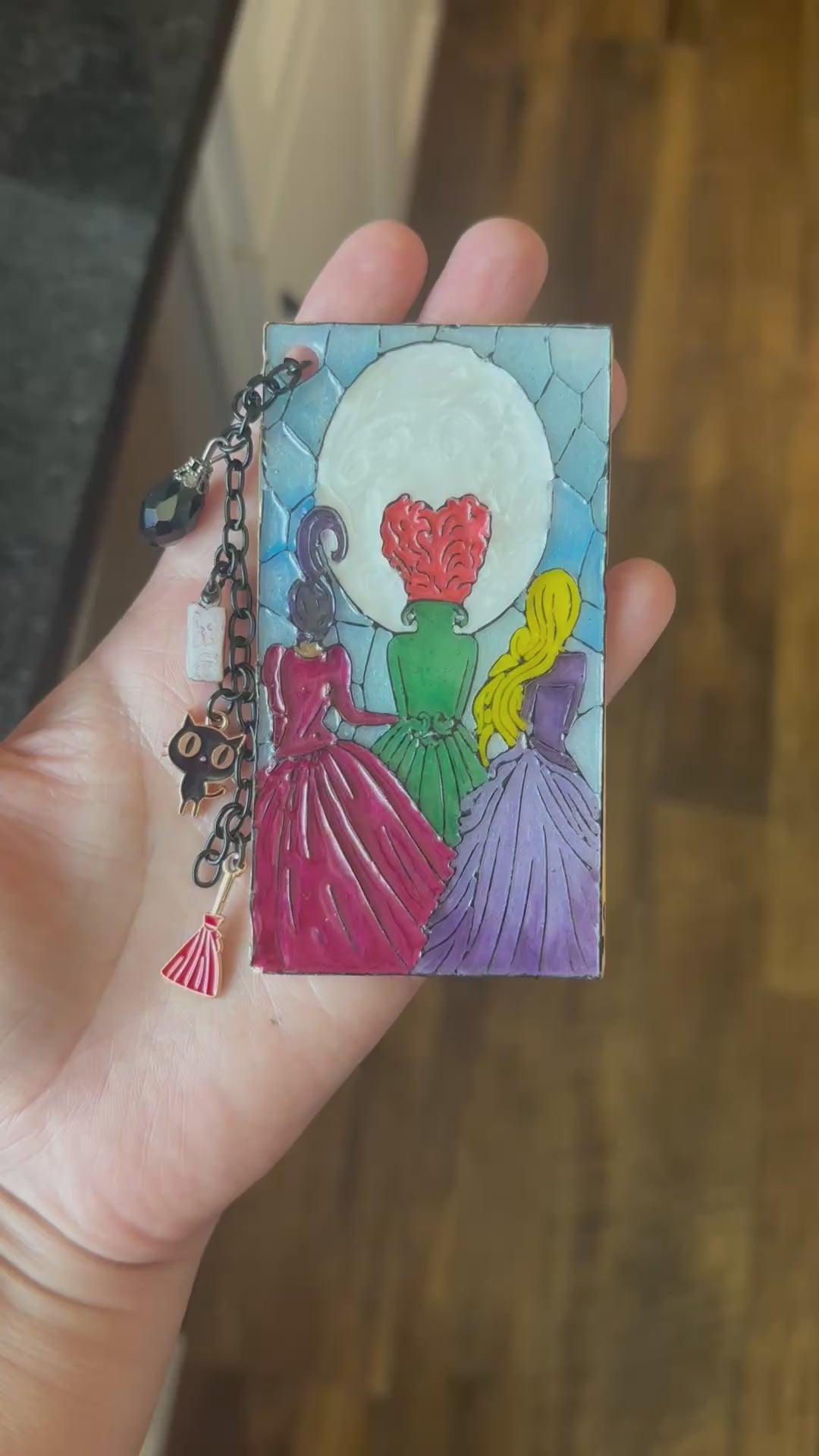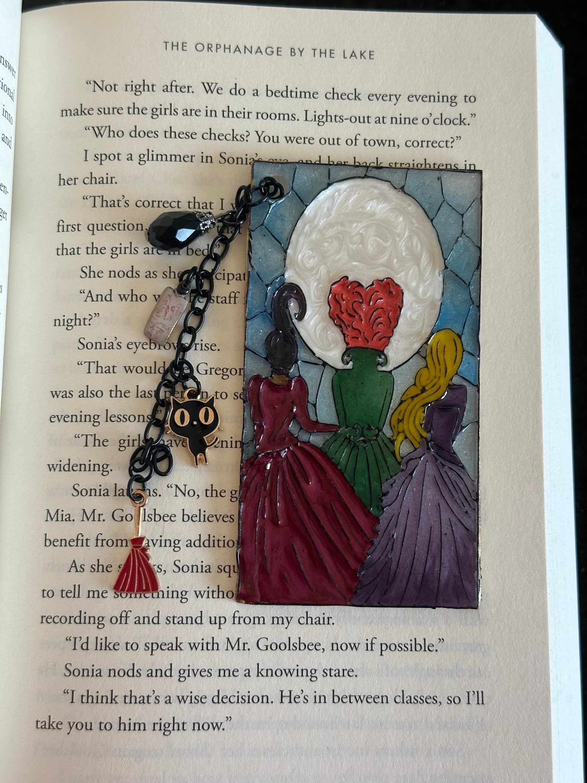 Sanderson Sisters Stained Glass-Inspired Polymer Clay Bookmark – Handmade with Charms & Black Flame Candle