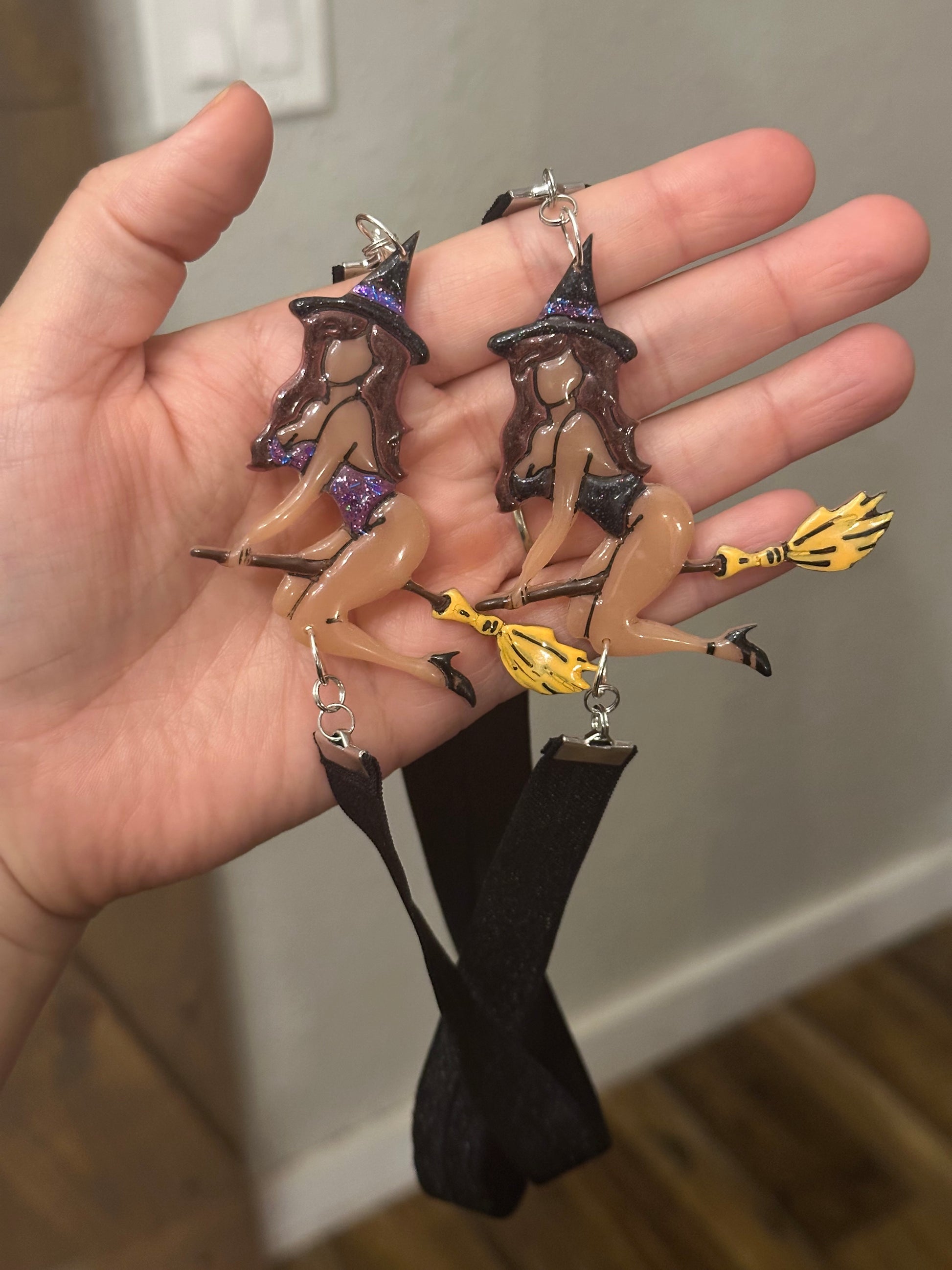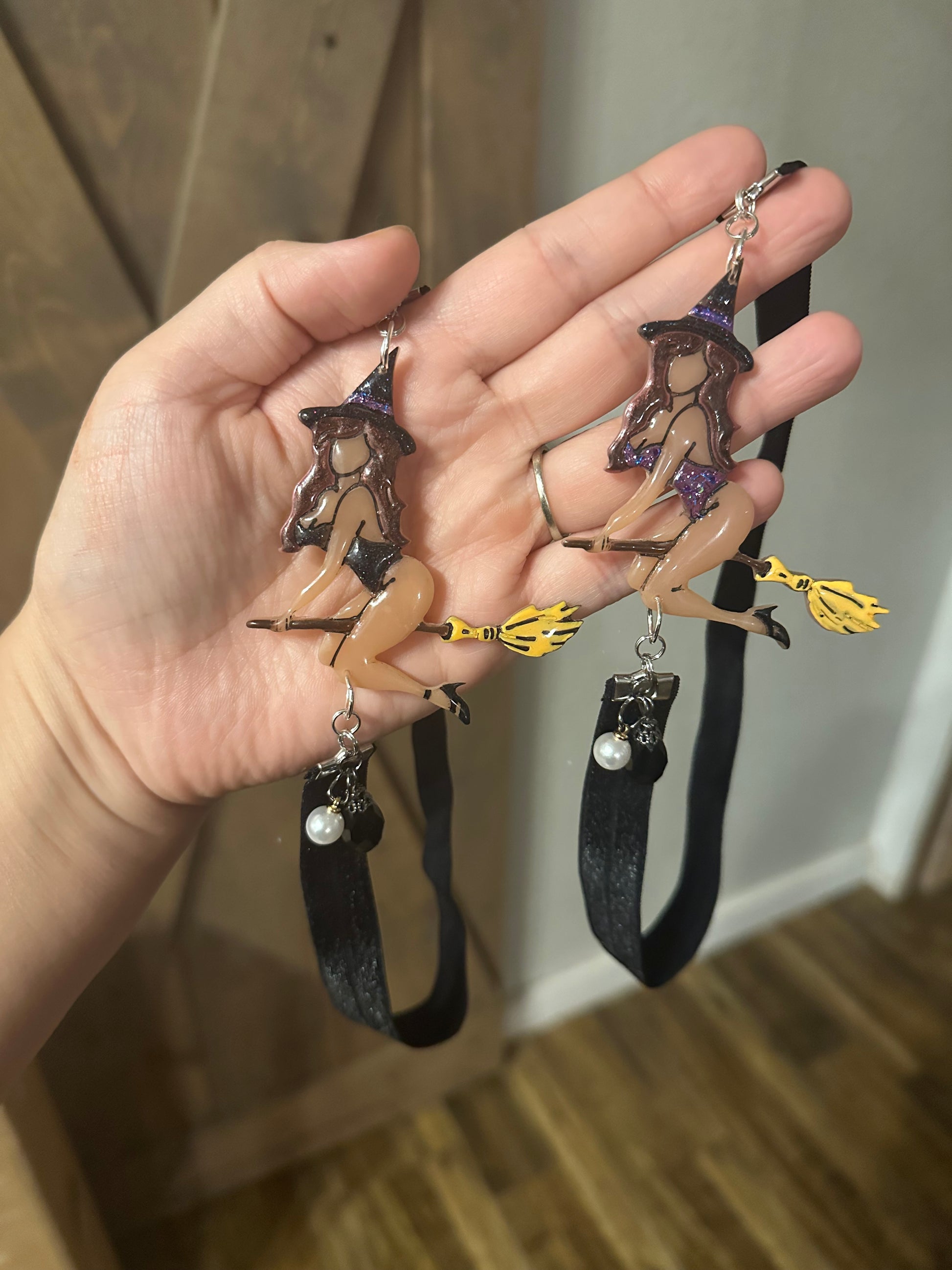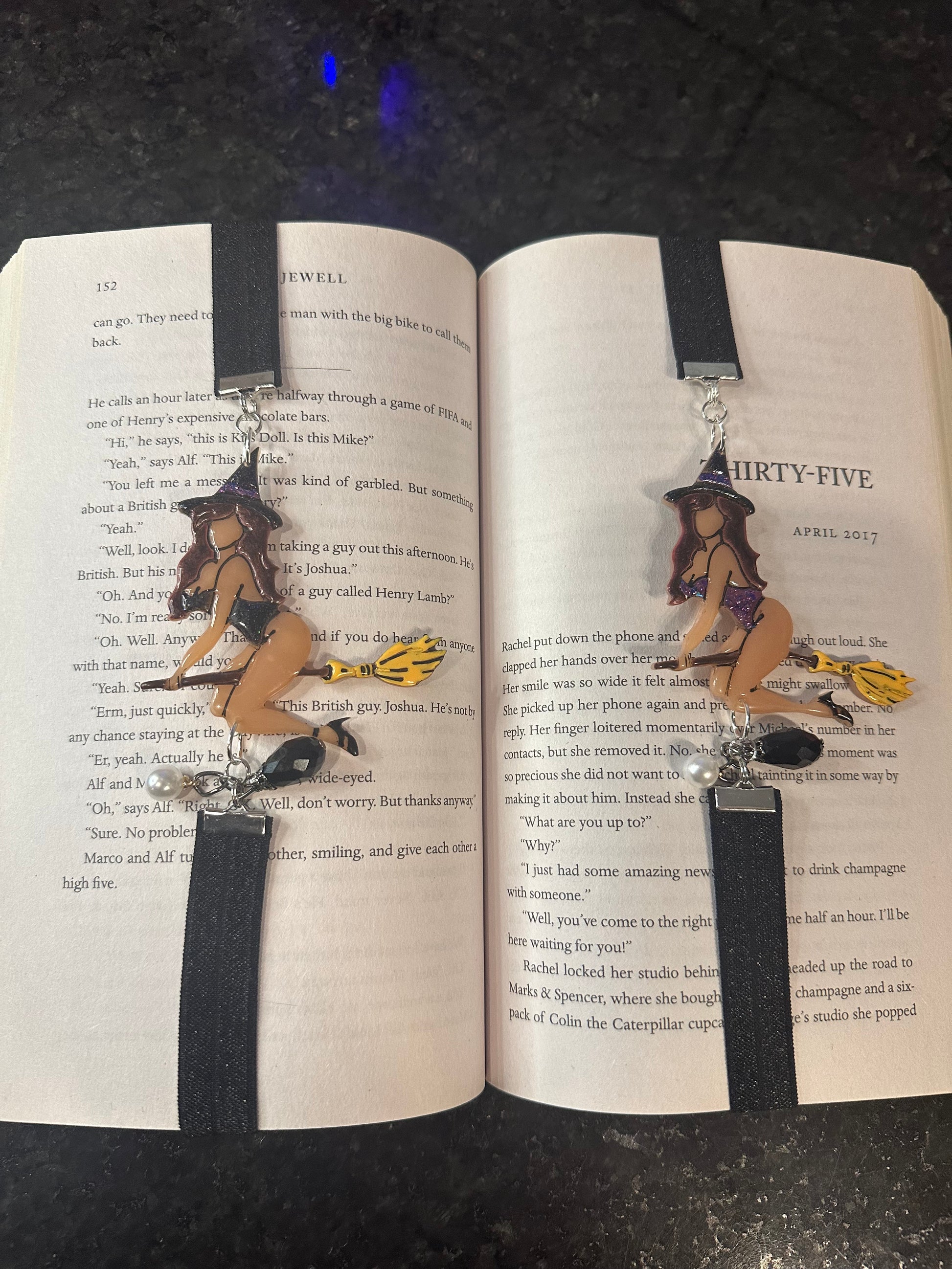 Sexy Witch Elastic Bookmark – Glitter Bodysuit on Broom (Black or Purple)