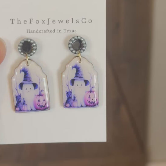 Bring a little spooky cute charm to your Halloween look! These handcrafted polymer clay earrings feature a sweet ghost in a vintage-style witch hat, carrying a glowing lantern with a tiny black cat and pumpkin by their side. The design sits on a black post accented with individually placed pearls, adding just the right touch of whimsy and elegance.