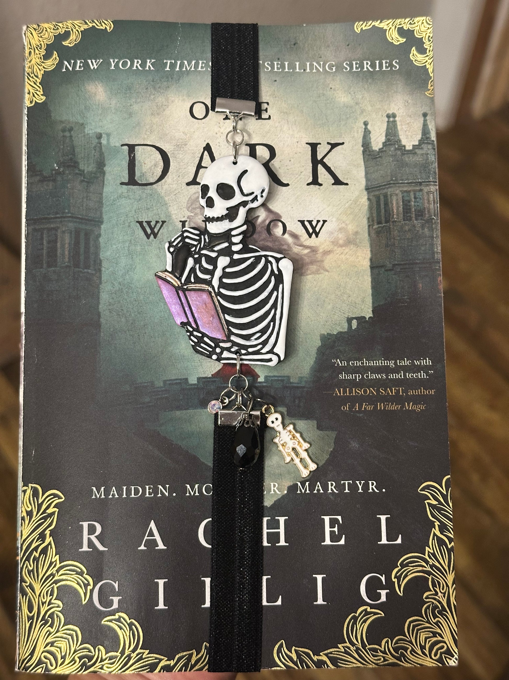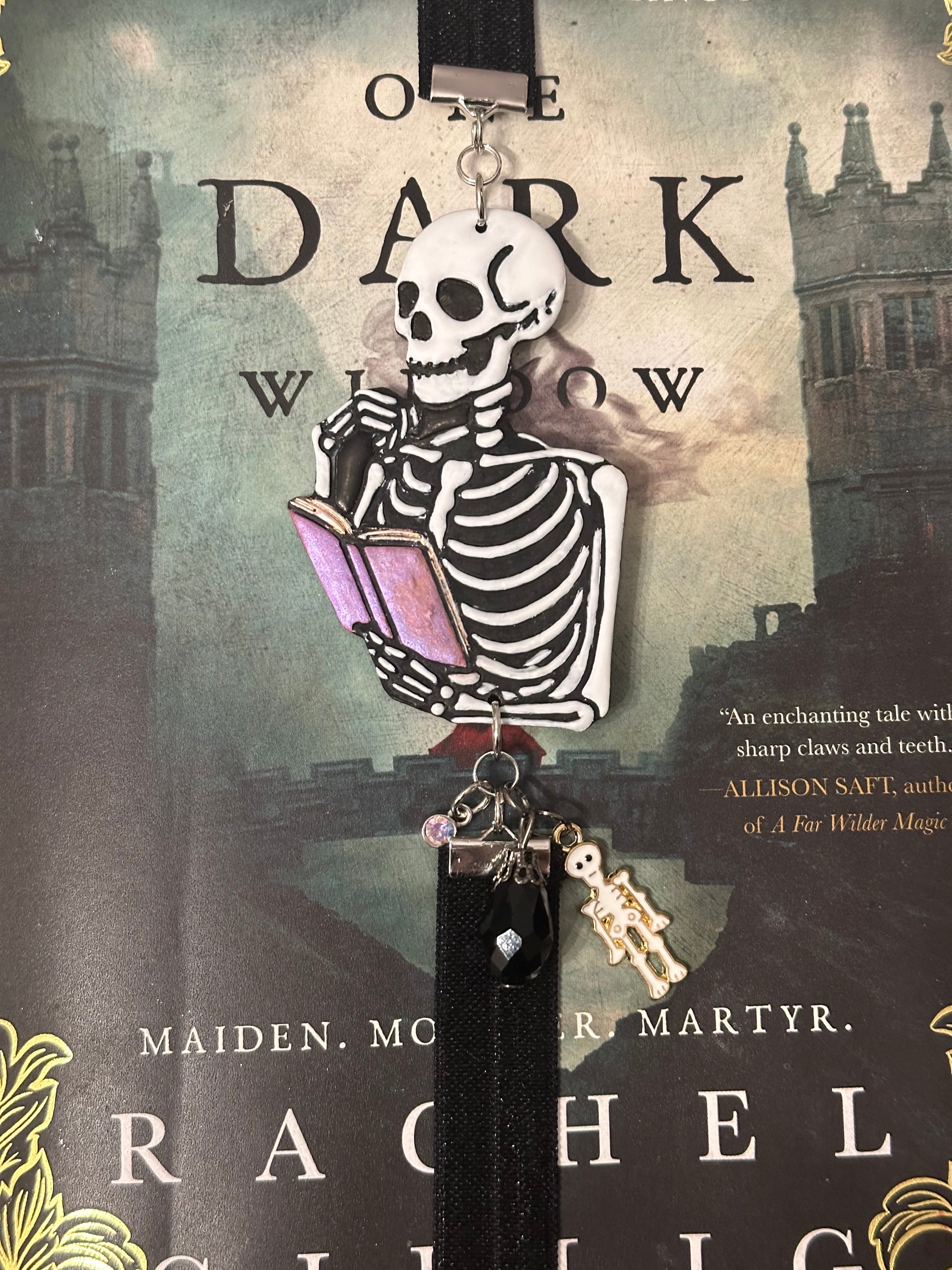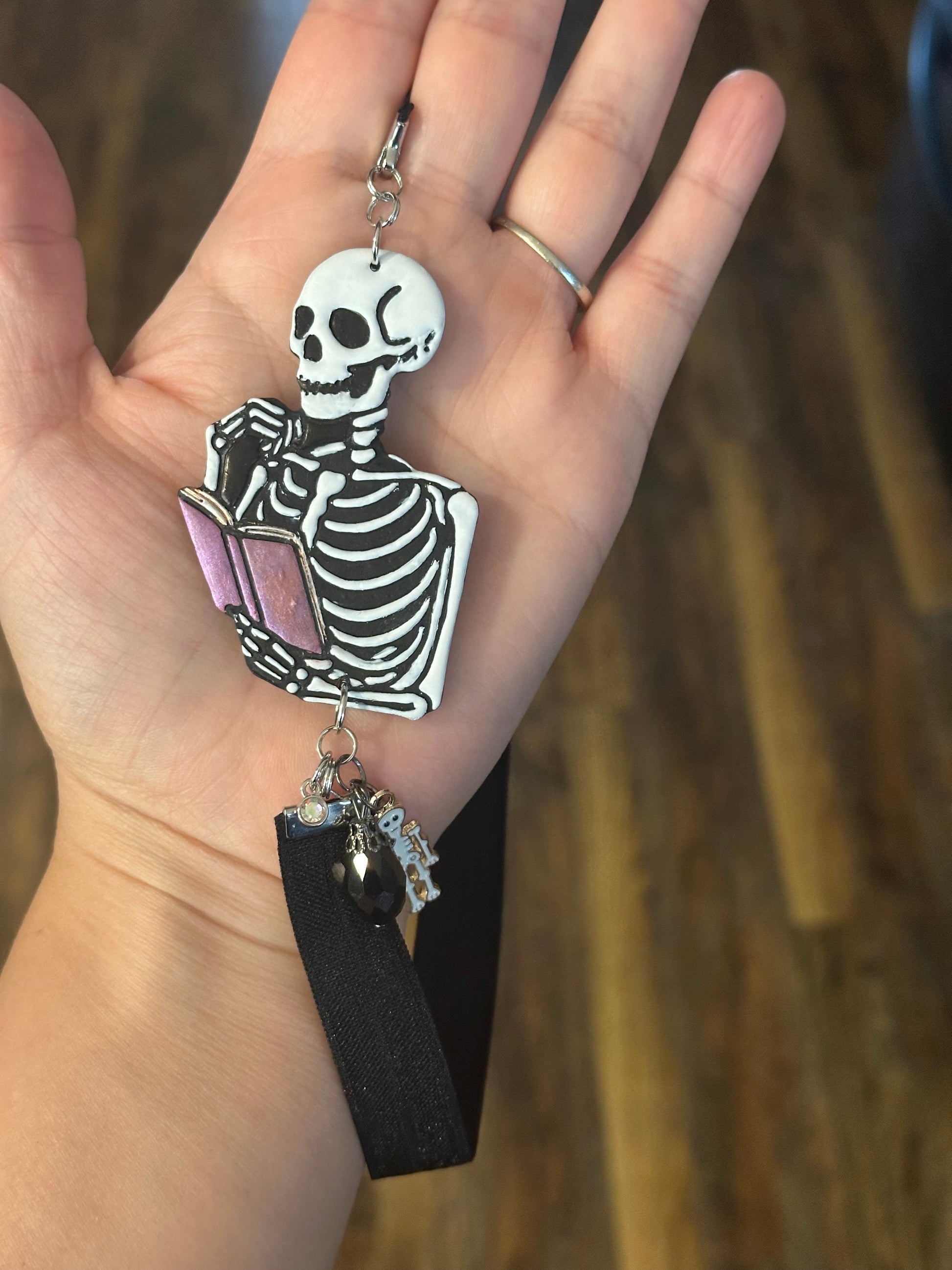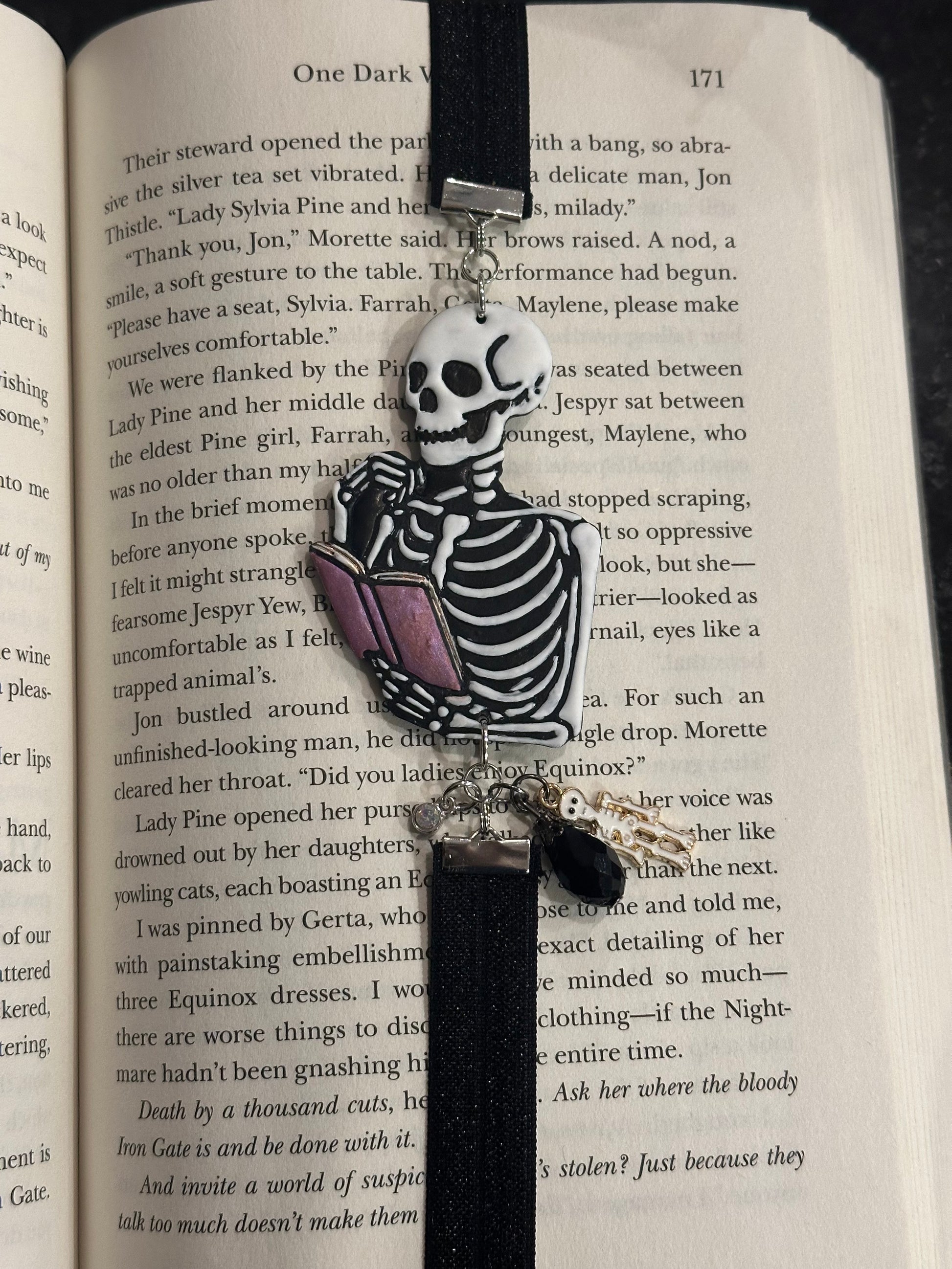 Spooky Skeleton Reading a Book – Handmade Polymer Clay Elastic Bookmark with Beads & Charms