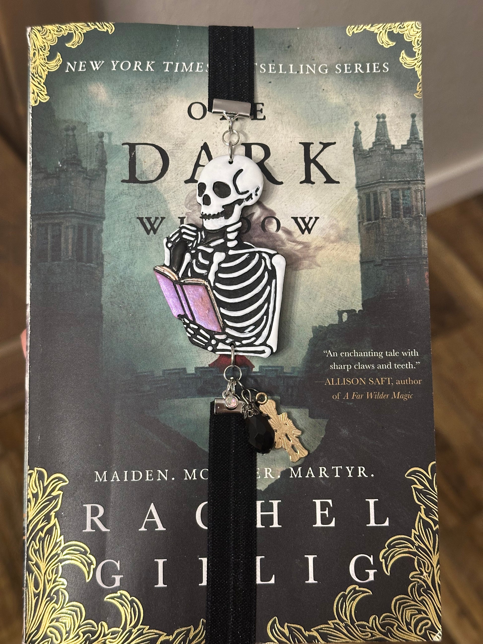 Meet your new favorite reading buddy – a tiny skeleton with its nose buried in a book. This handmade polymer clay elastic bookmark is both spooky and sweet, making it the perfect accessory for Halloween reads, gothic novels, or your everyday page-turners.