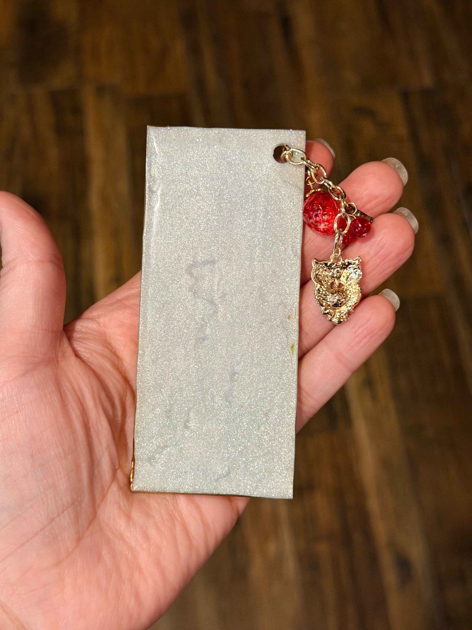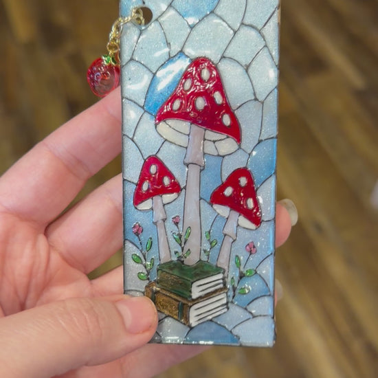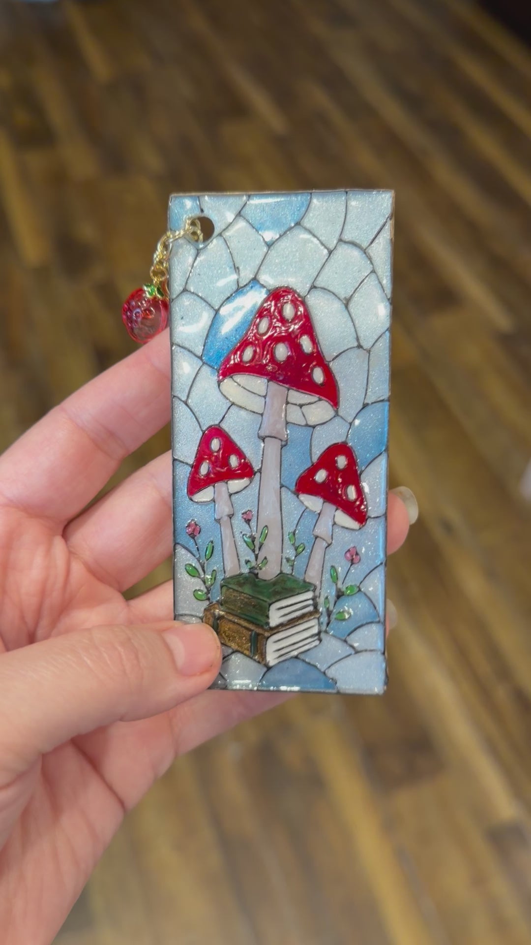 Elevate your reading routine with this magical stained-glass inspired bookmark featuring vibrant red mushrooms, stacked books, and sparkling resin details. Each piece is handcrafted from durable polymer clay, hand-colored with resin for a luminous stained-glass effect, and finished with a protective resin seal for long-lasting shine.