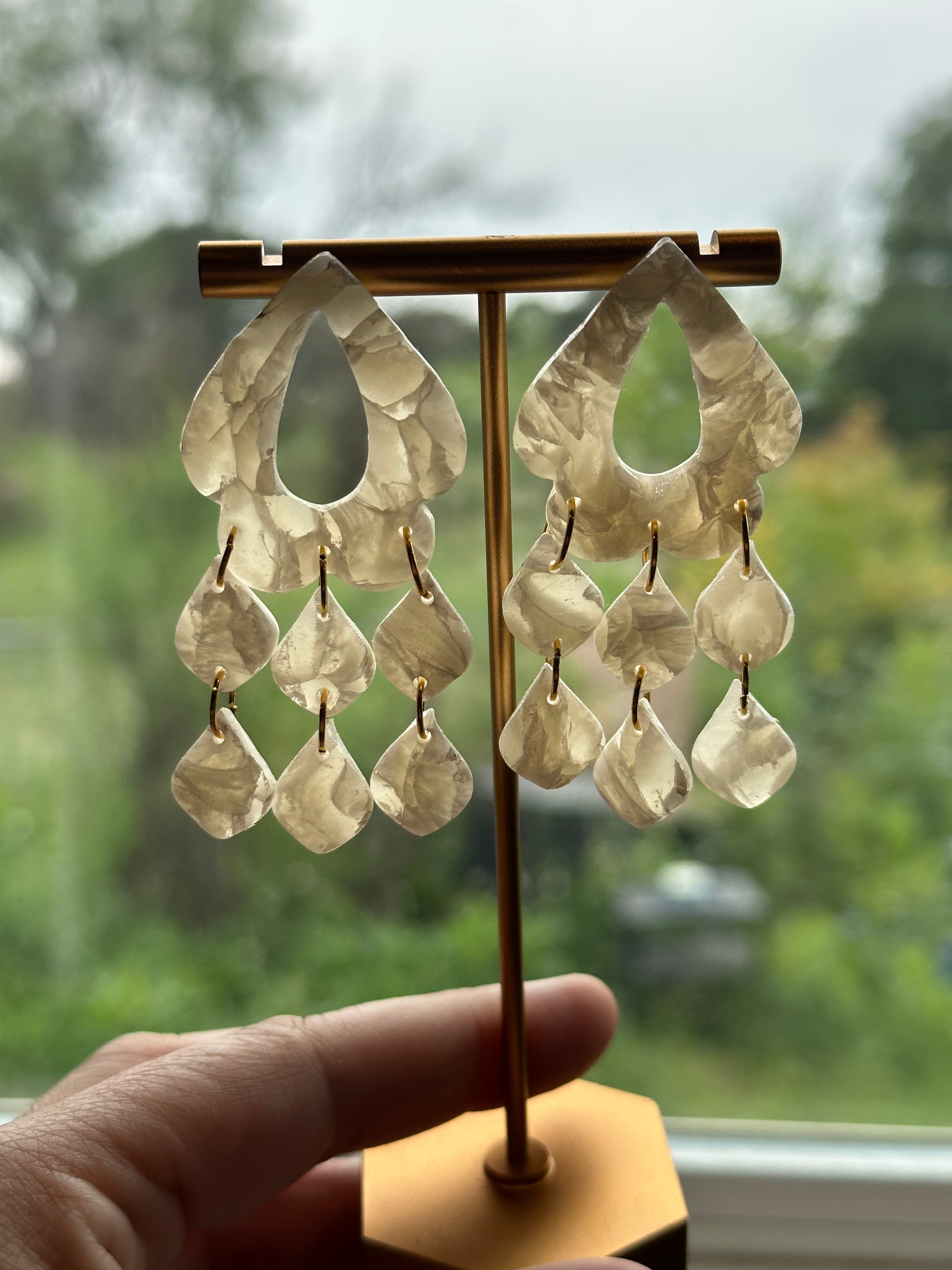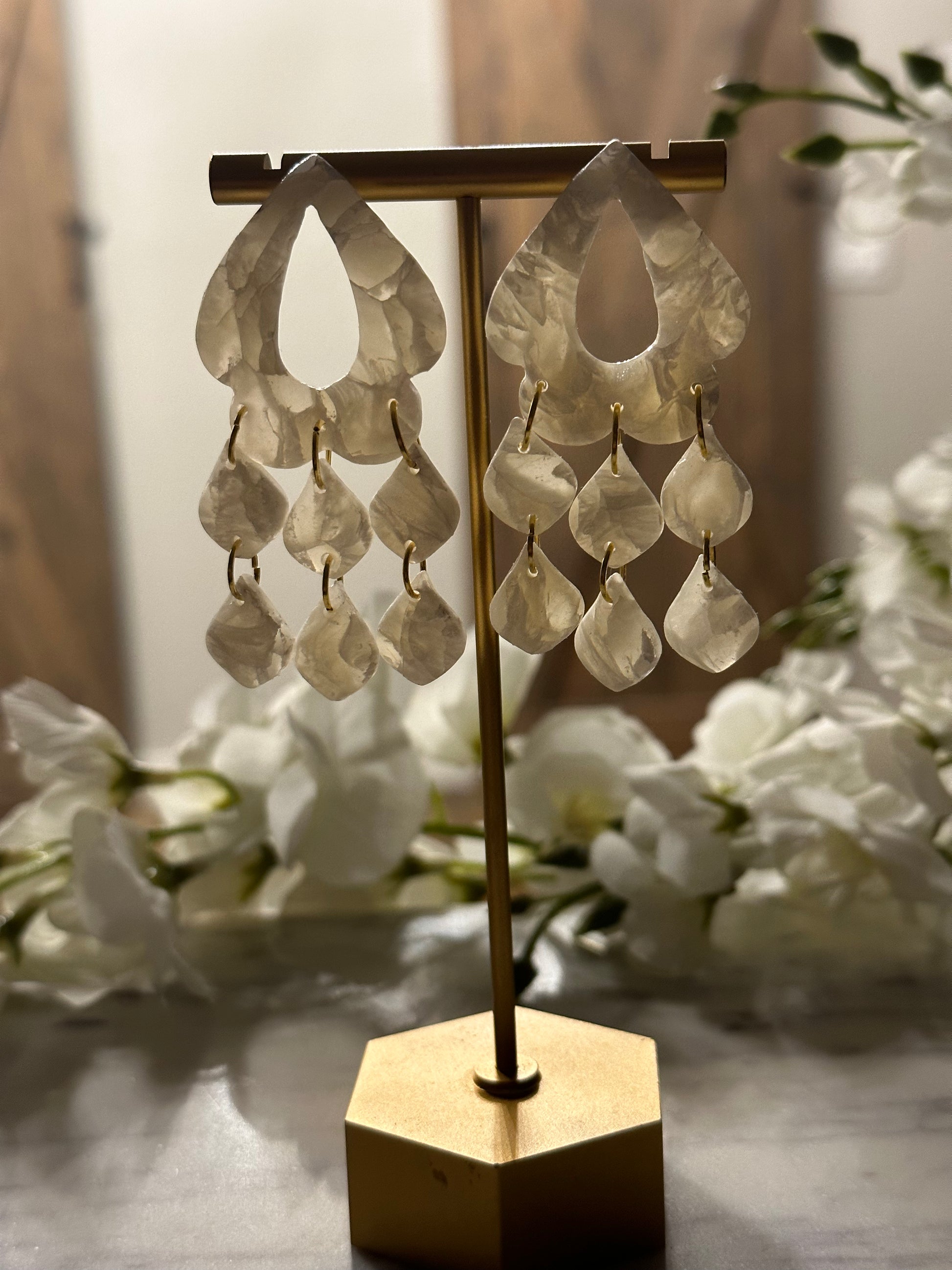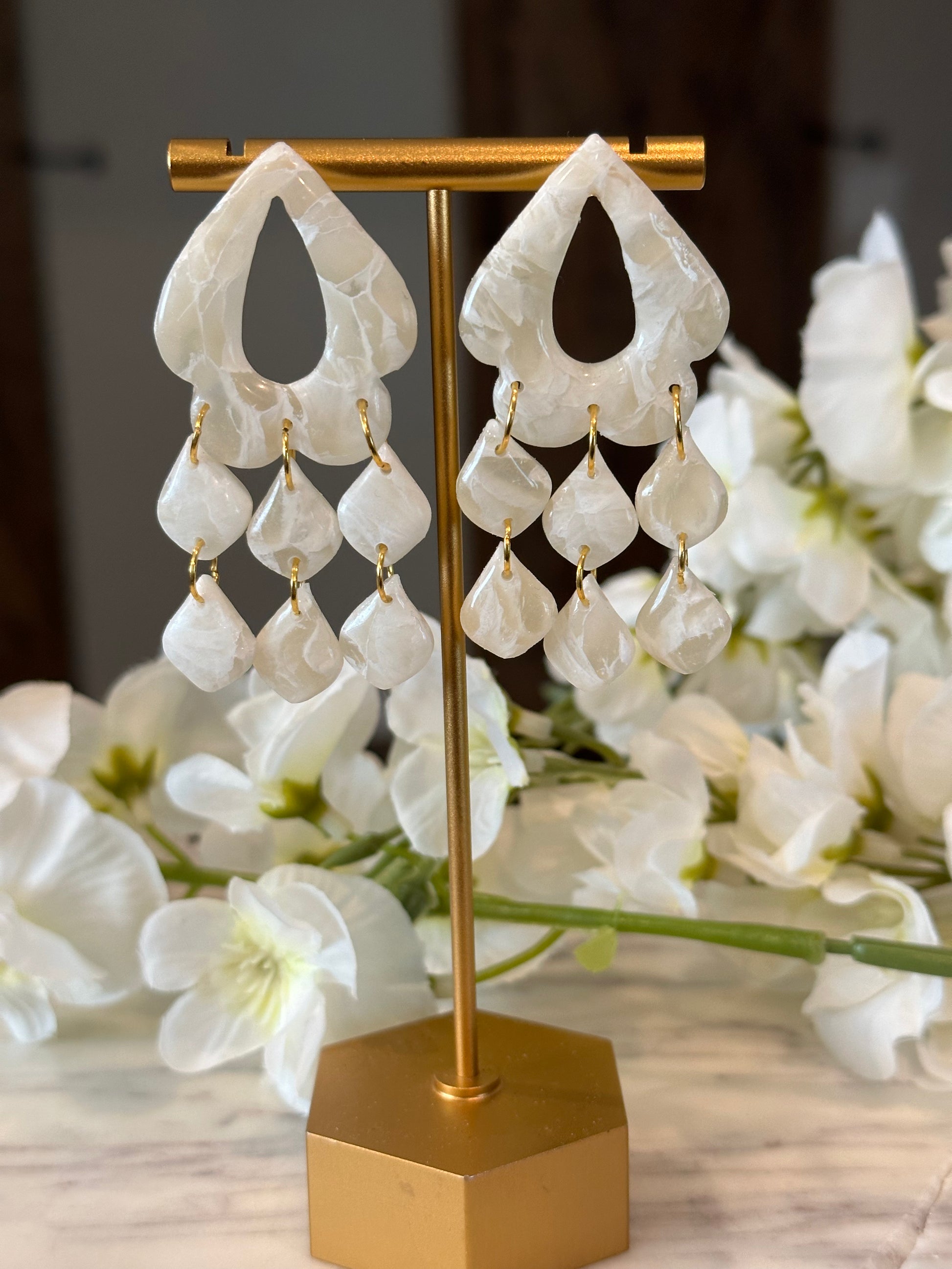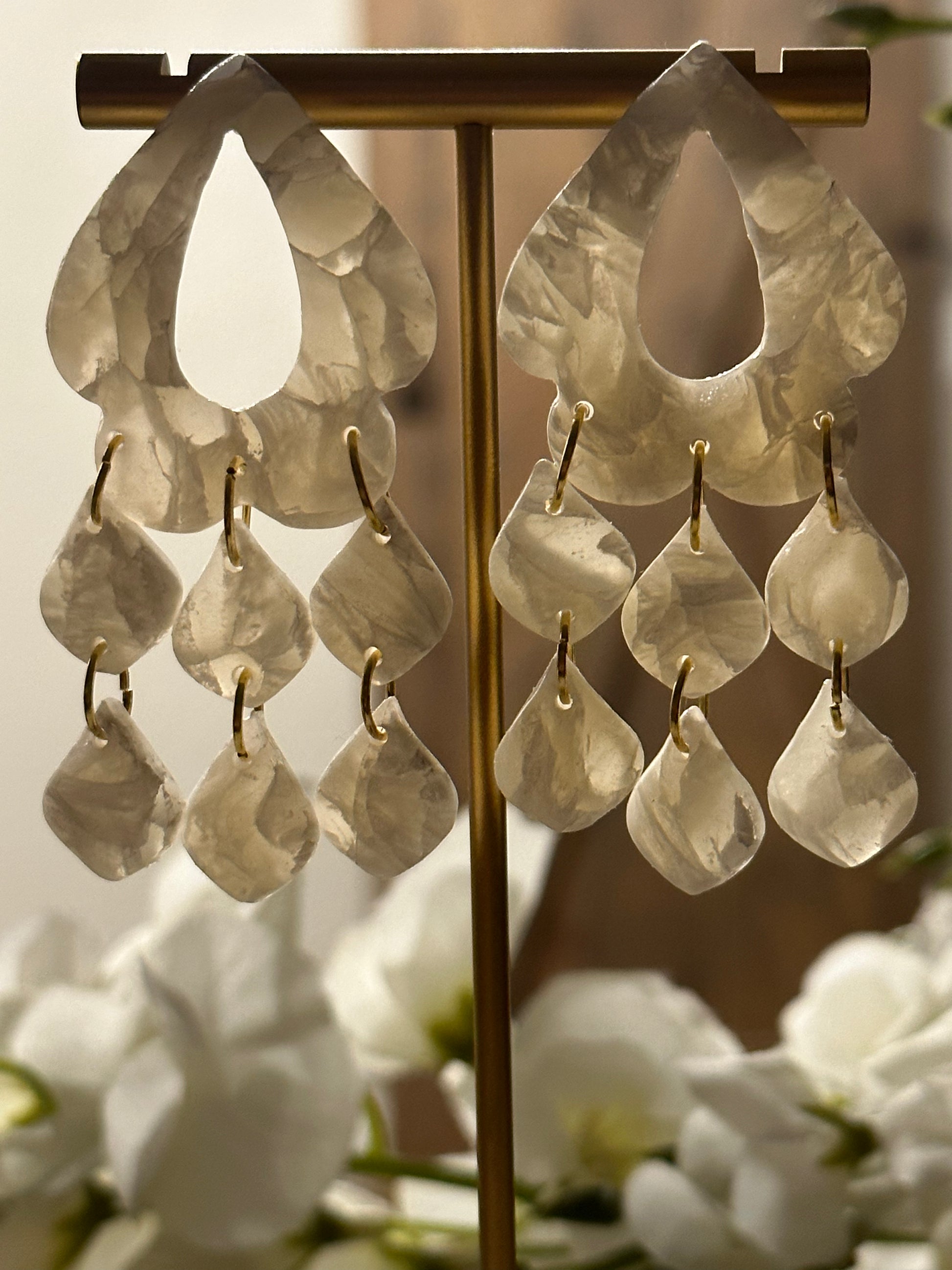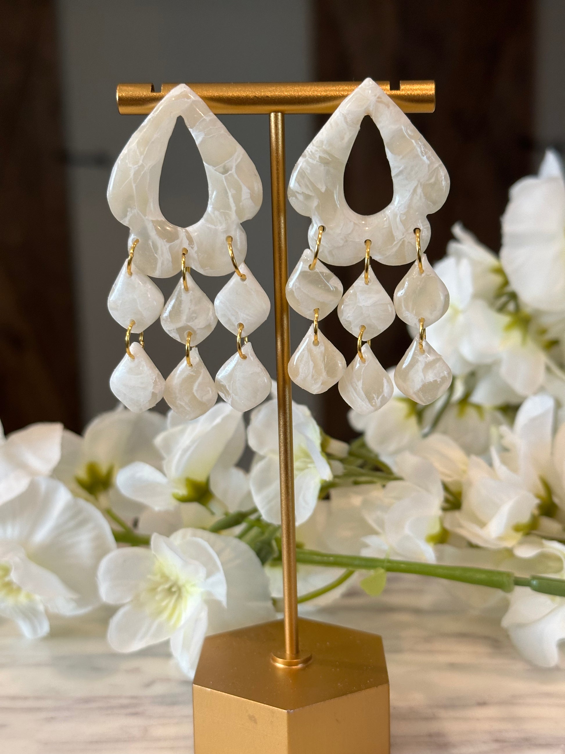 This pair is a translucent with white, beauty. It is a perfect statement earring for any bride.