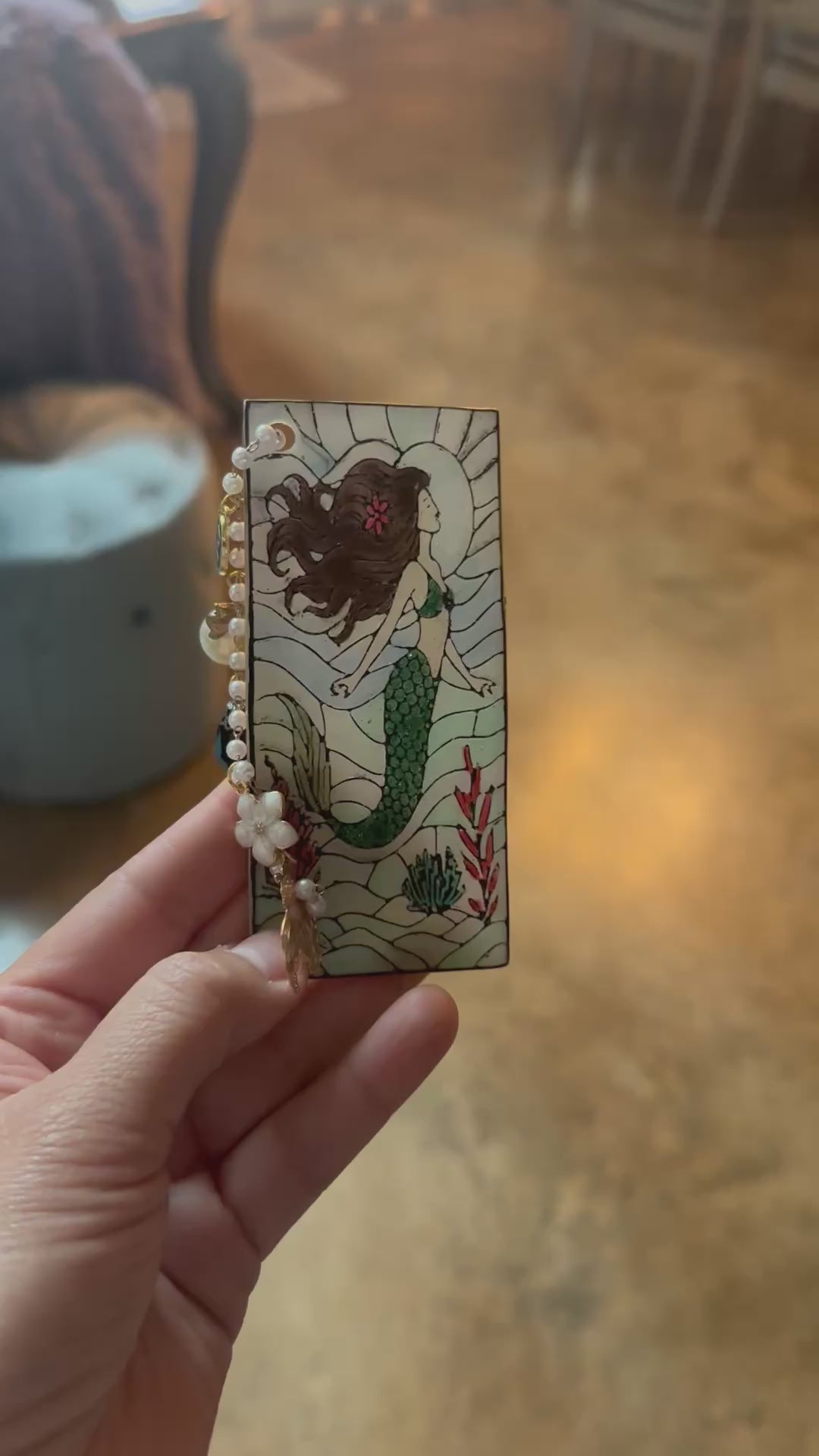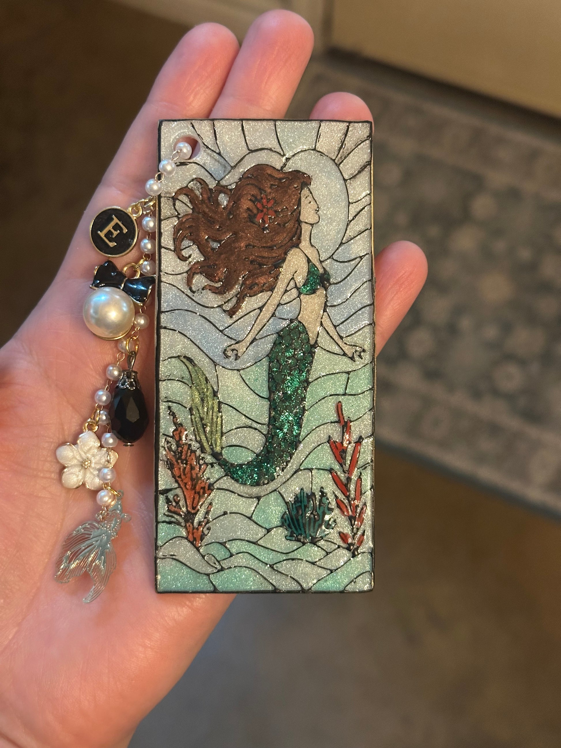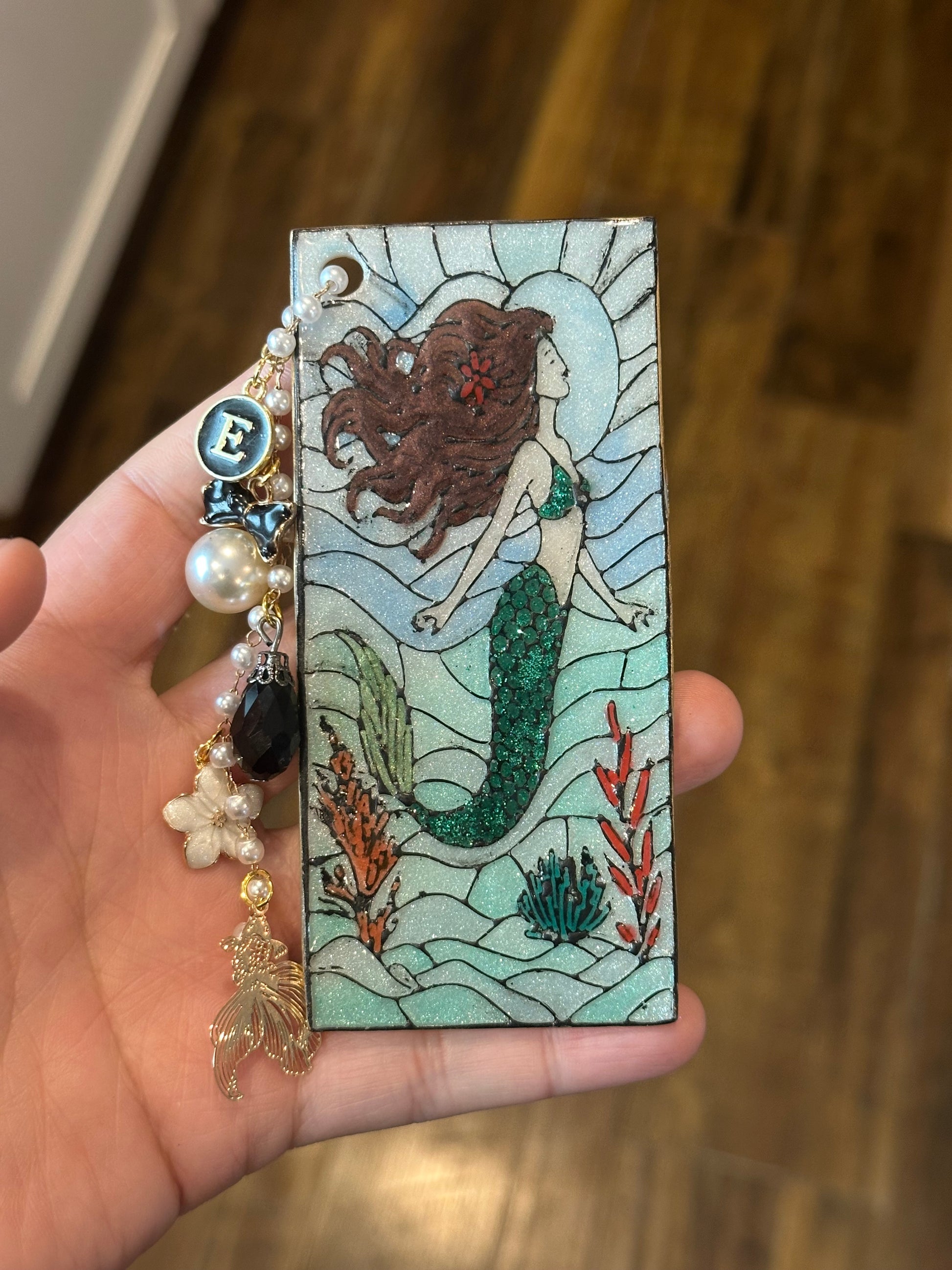 Mermaid Stained Glass Style Bookmark – Polymer Clay with Pearl Chain & Charms