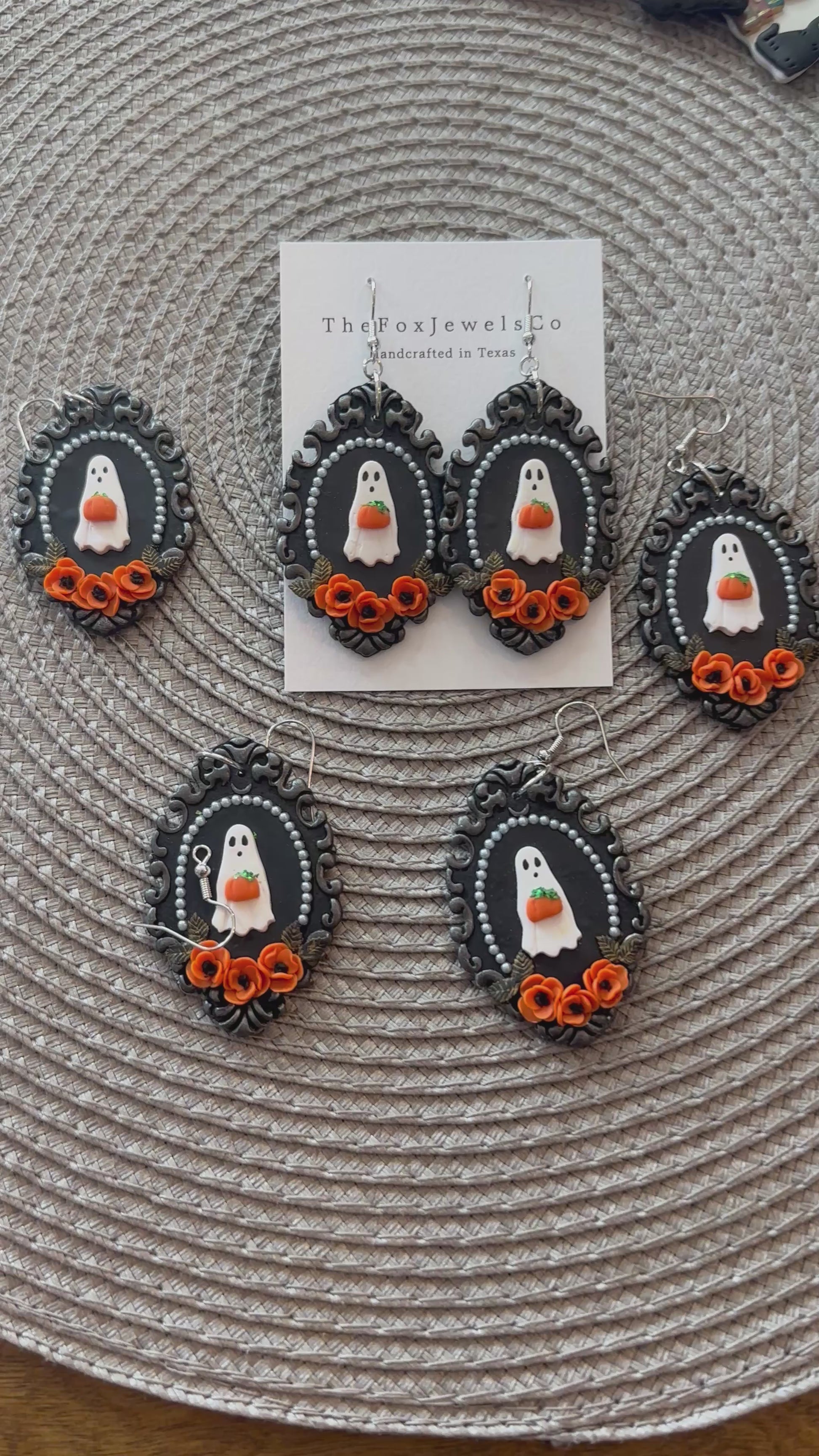 Vintage Ghost & Pumpkin Earrings – Pearl Frame with Floral Detail